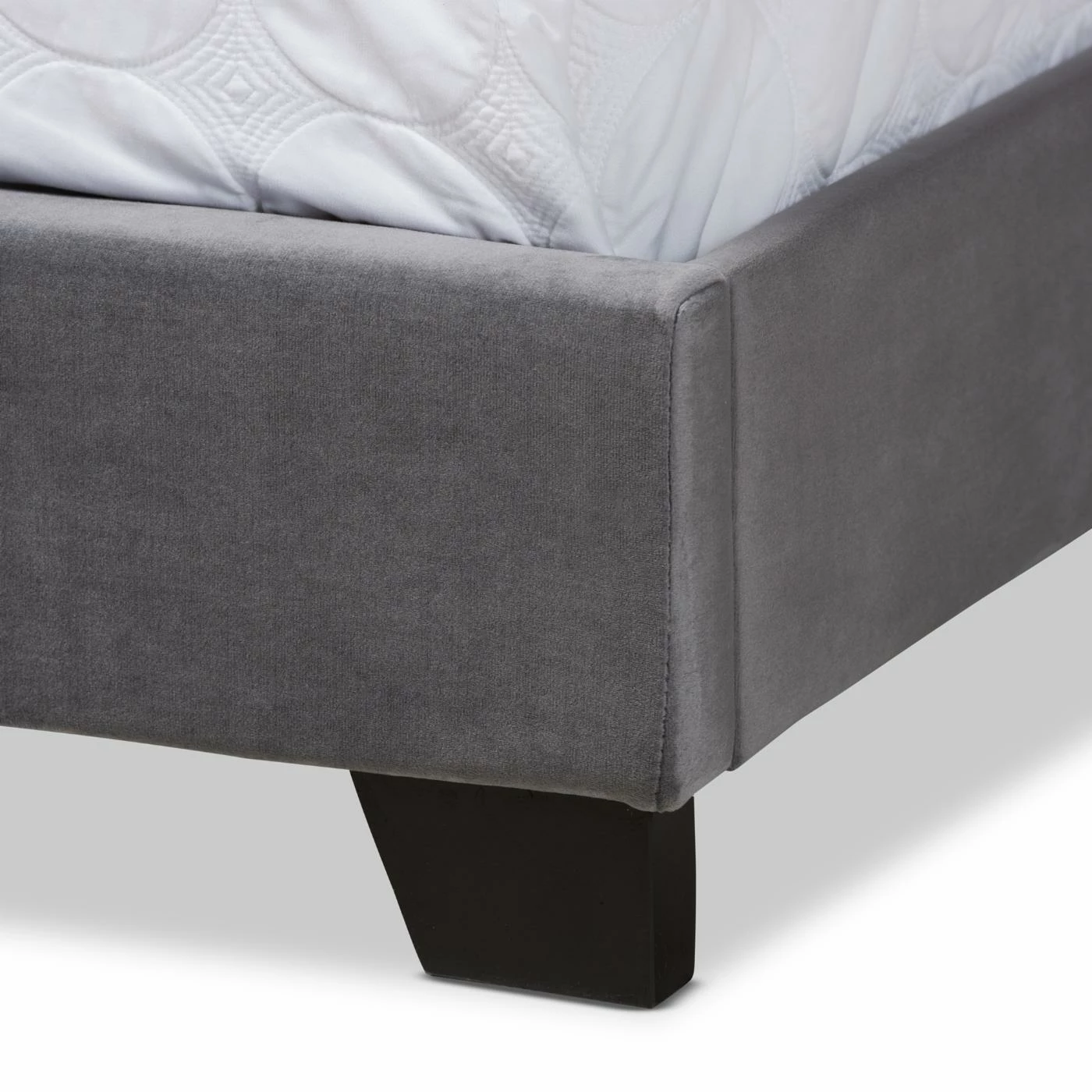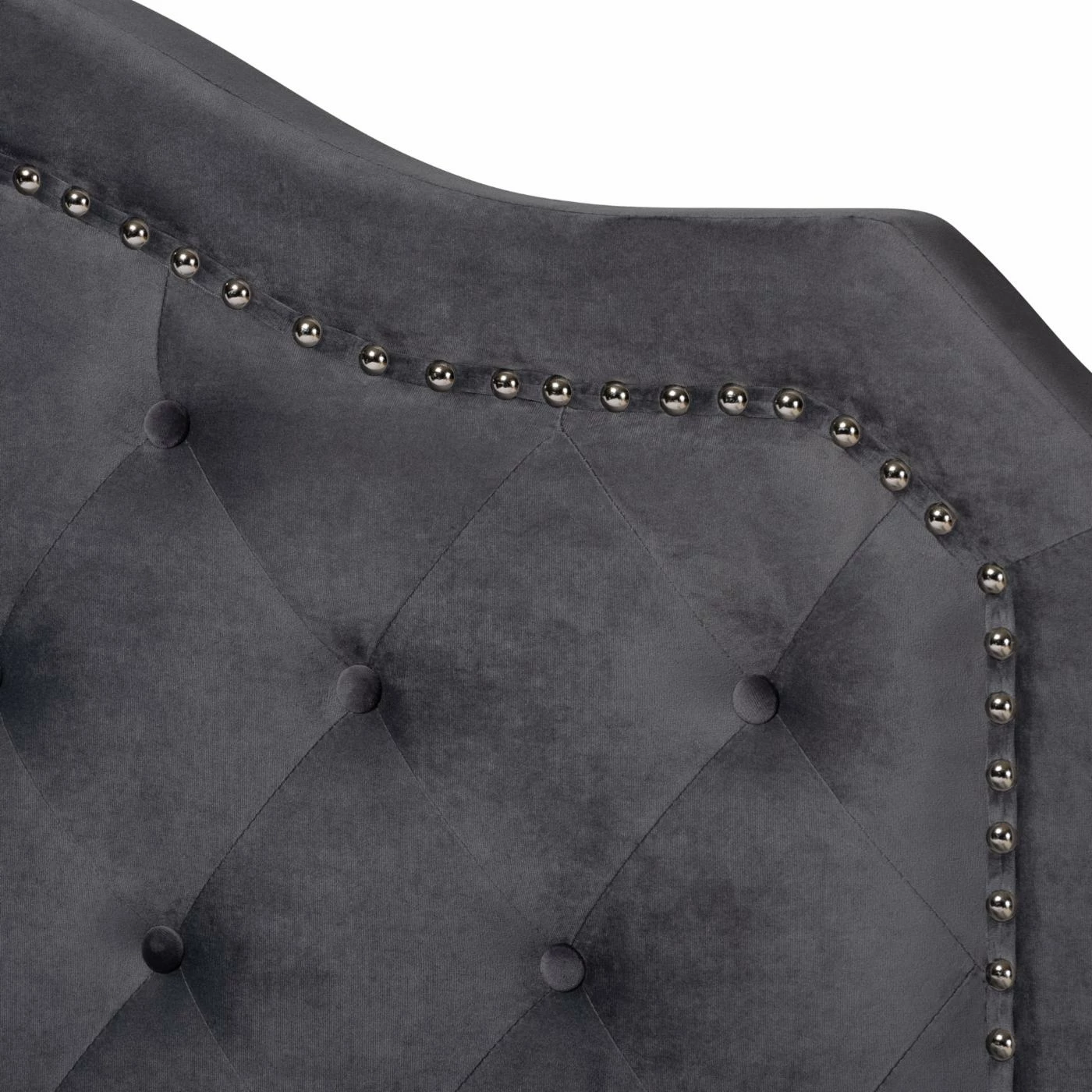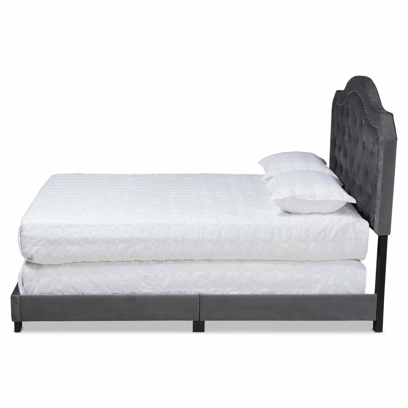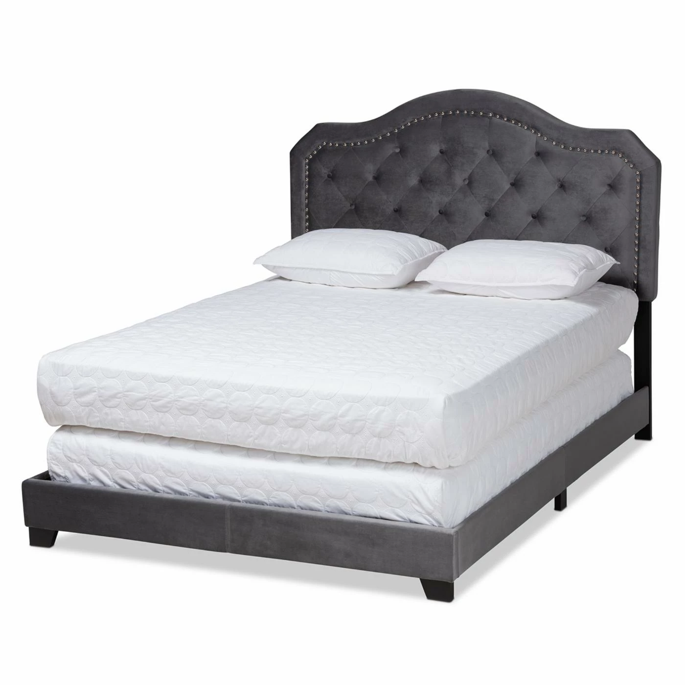 Transform your bedroom in to a glamorous hideaway with the Baxton Studio Samantha Upholstered Button Tufted Panel Bed. Constructed from wood, the Samantha is upholstered in a soft, foam filled velvet fabric that provides ample comfort for you to lean against as you read or watch TV. The headboard features a regal silhouette emphasized by silver nail heads and button tufting. Black tapered feet complete the look. This bed requires a box spring for use. The Samantha bed is made in Malaysia and requires assembly.