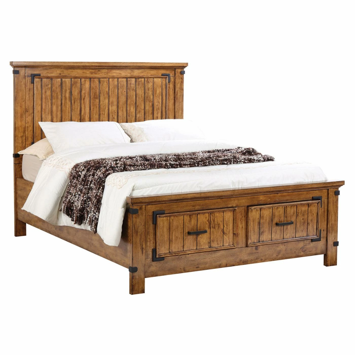 Bring rustic style to your bedroom with the Coaster Furniture Brenner Storage Bed, boasting slatted designs at the head and footboard along with dark metal accents and a warm honey finish. This unique bed includes storage drawers at the end so you can keep throw blankets, robes, and pajamas neatly tucked away and out of view.