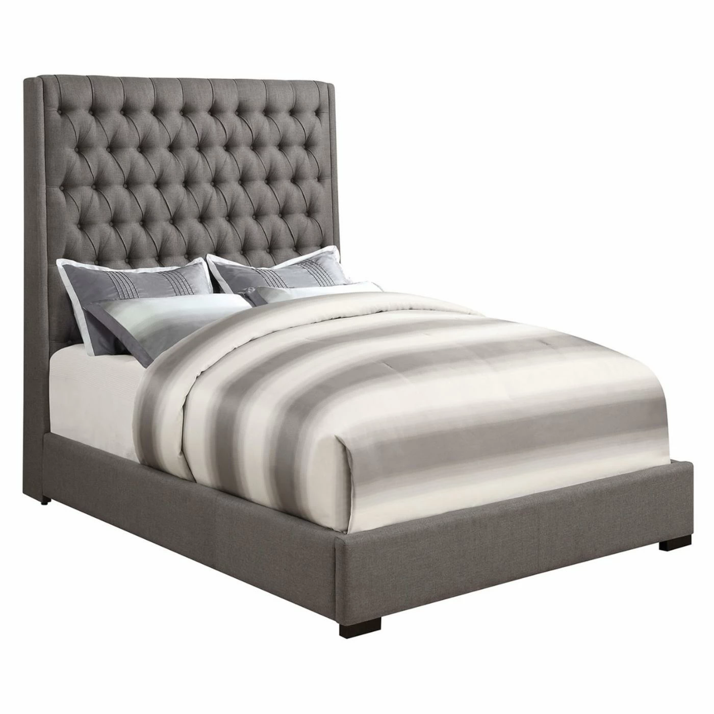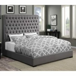 The Coaster Furniture Camille Upholstered Bed has a tall, towering headboard upholstered in a warm gray-colored fabric, finished with tufted detailing. This stylish bed sits on a sturdy wood platform base surrounded by matching fabric, and rests on stable wood legs finished in brown for a bold pop.
