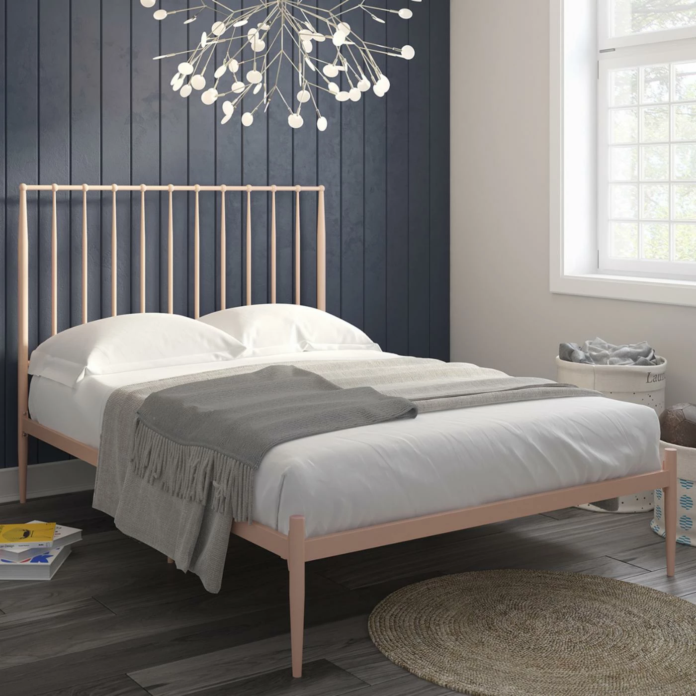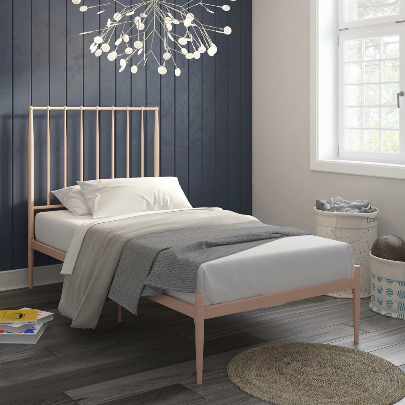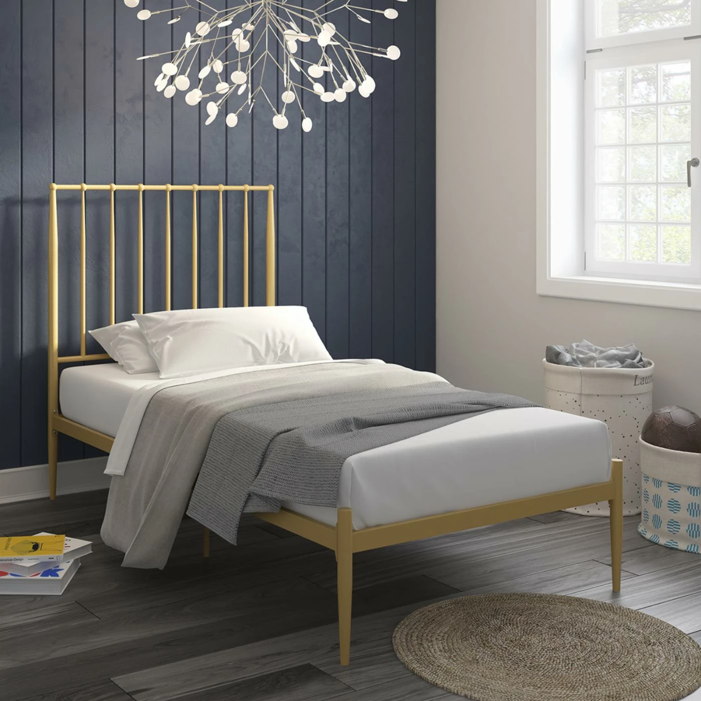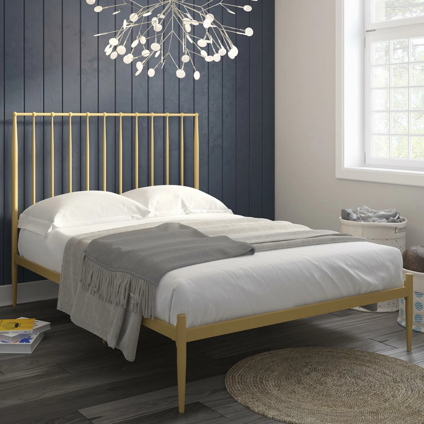Chic, contemporary style is simple with the DHP Giulia Modern Metal Platform Bed. The timeless, metal slated headboard and tapered legs give the frame an effortless sophisticated edge. The frame, side rails, and metal slats are made of quality sturdy metal made to stand the test of time. Your choice of available sizes and metal finishes allow you to tailor the look you wish to achieve. An 11-inch clearance from the top of the platform gives you space to store seasonal clothing, bedding, or boxes.
