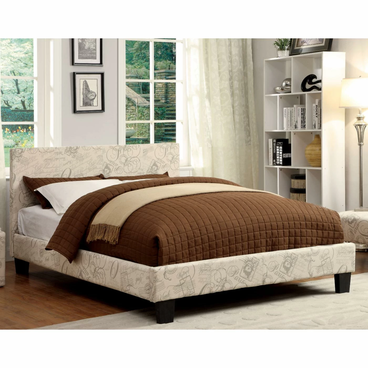 The Kristoff Low Profile Upholstered Bed celebrates the romantic appeal of worldly travel and correspondence. This attractive, abstract imagery is placed on a smoky neutral background and couples with modernist clean lines to establish an ambiance of romance that crosses borders and spans ages. Before you’re ready to drift off to dreamland, however, the comfortably padded headboard provides the perfect place to sit up and read, journal, or listen to whatever music tickles your imagination and intellect.