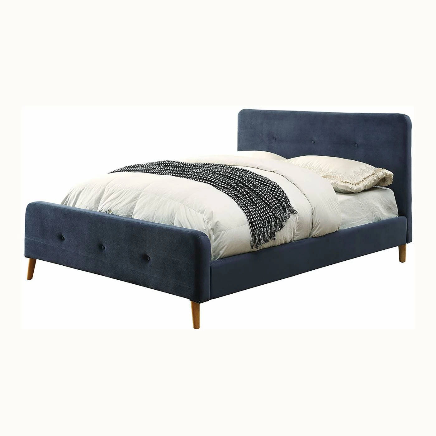 - Button tufted detailing on the headboard, footboard