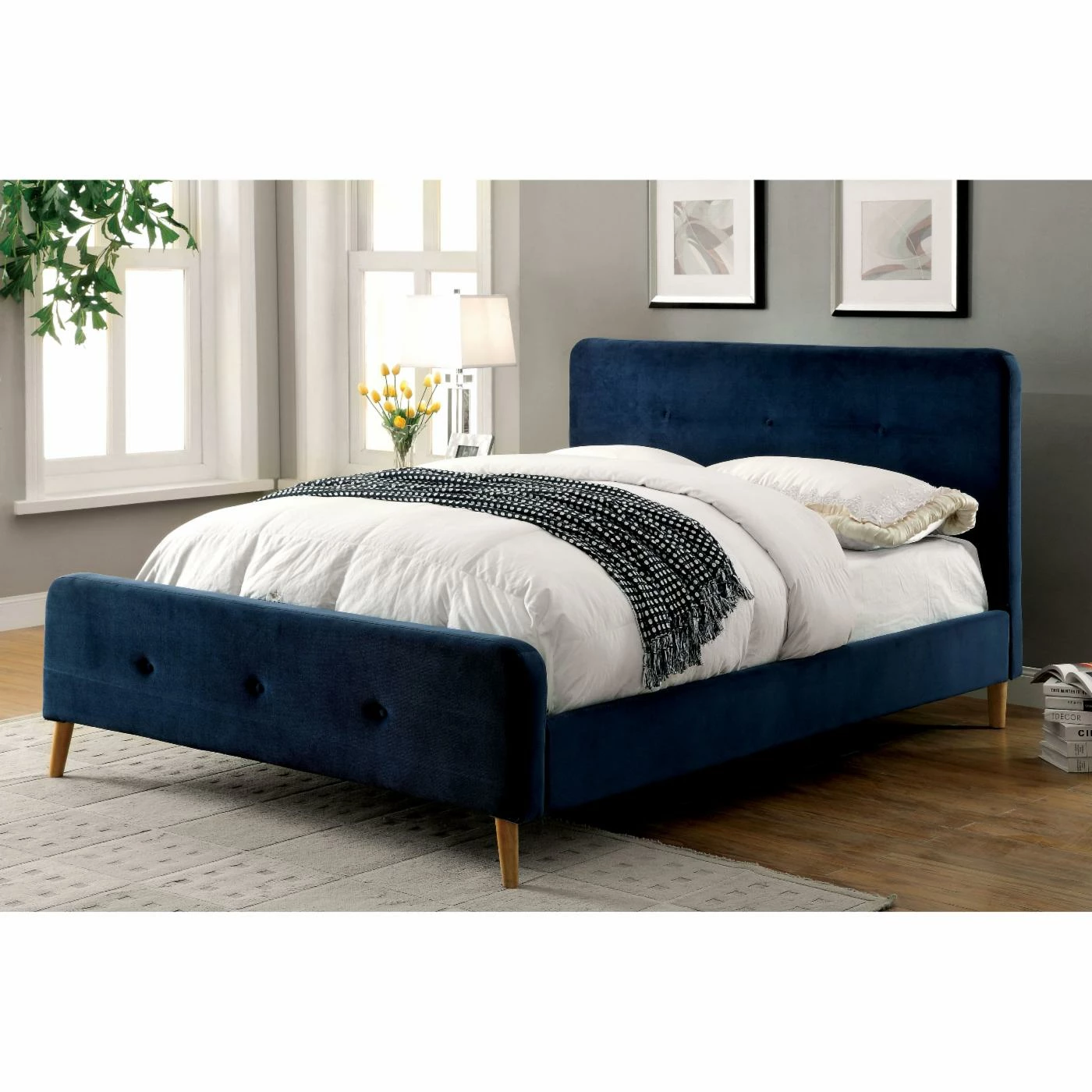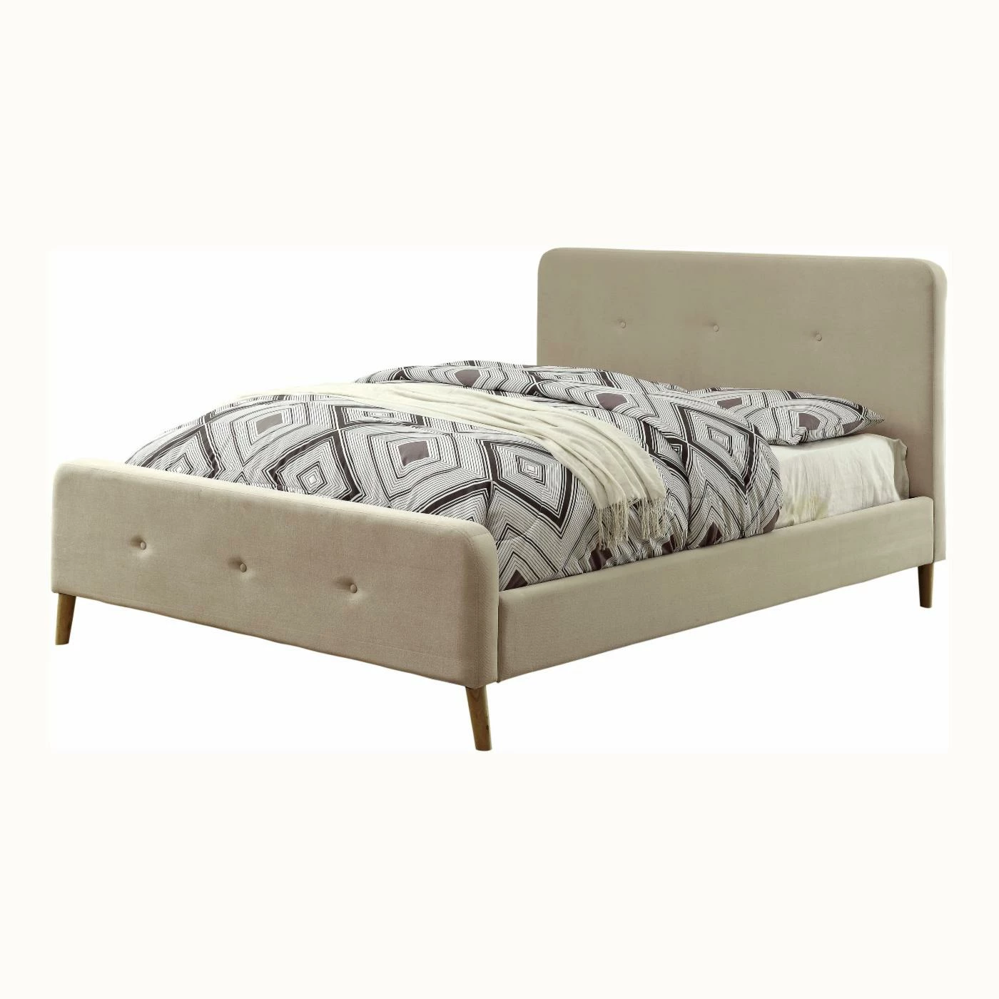 Mid-century elegance radiates from this cozy Furniture of America Leandra Upholstered Platform Bed. It’s crafted from solid wood and wood veneer with soft flannelette fabric upholstery on the entire frame. This platform bed is also offered in your choice of available finish options so you can match it with your specific bedroom decor. It features curved edges along with angled legs for sturdy support. Button tufted detailing on the high profile headboard and low profile footboard adds eye-catching allure. Plus, this bed includes mattress-ready slat kit.