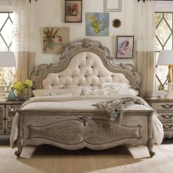 The gloriously-appointed Hooker Furniture Chatelet Upholstered Panel Bed is a luxurious example of shabby chic design. This grand panel bed is graced with an elaborately carved headboard. A curvaceous interior panel is padded and upholstered in a neutral viscose and linen blend turtle dove fabric. The low profile footboard boasts generous moldings, elegant carvings, and cabriole legs. This upholstered panel bed is well-made of poplar and hardwood solids with pecan veneers. It’s drenched in a perfectly distressed, parchment colored antique linen finish. Choose from popular size options.