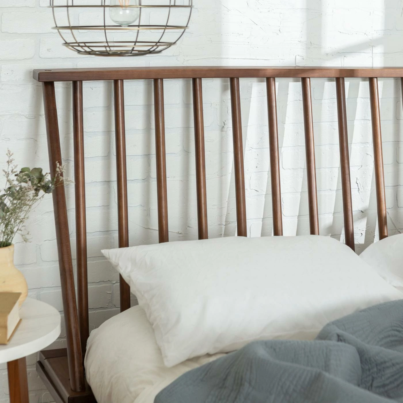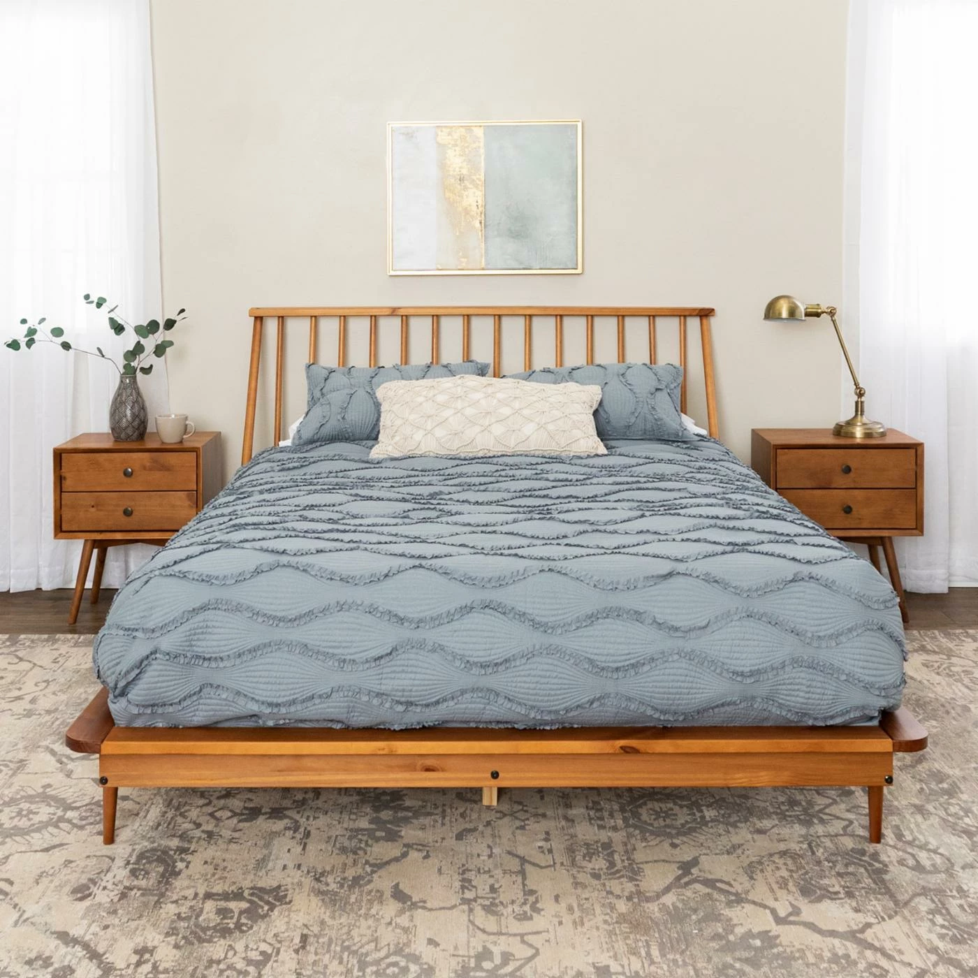 The Manor Park Modern Spindle Platform Bed features a low-profile design that will bring modern style to your space. This platform bed is constructed of solid pine and available in finish options to best coordinate with existing bedroom furniture and décor. Slim lines make up the design, from the angled, spindle-style headboard to the tapered legs.
