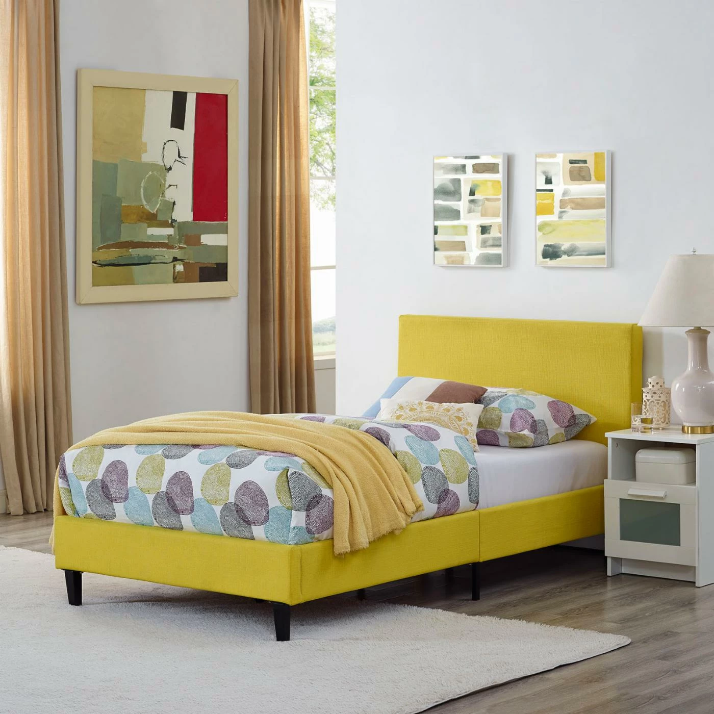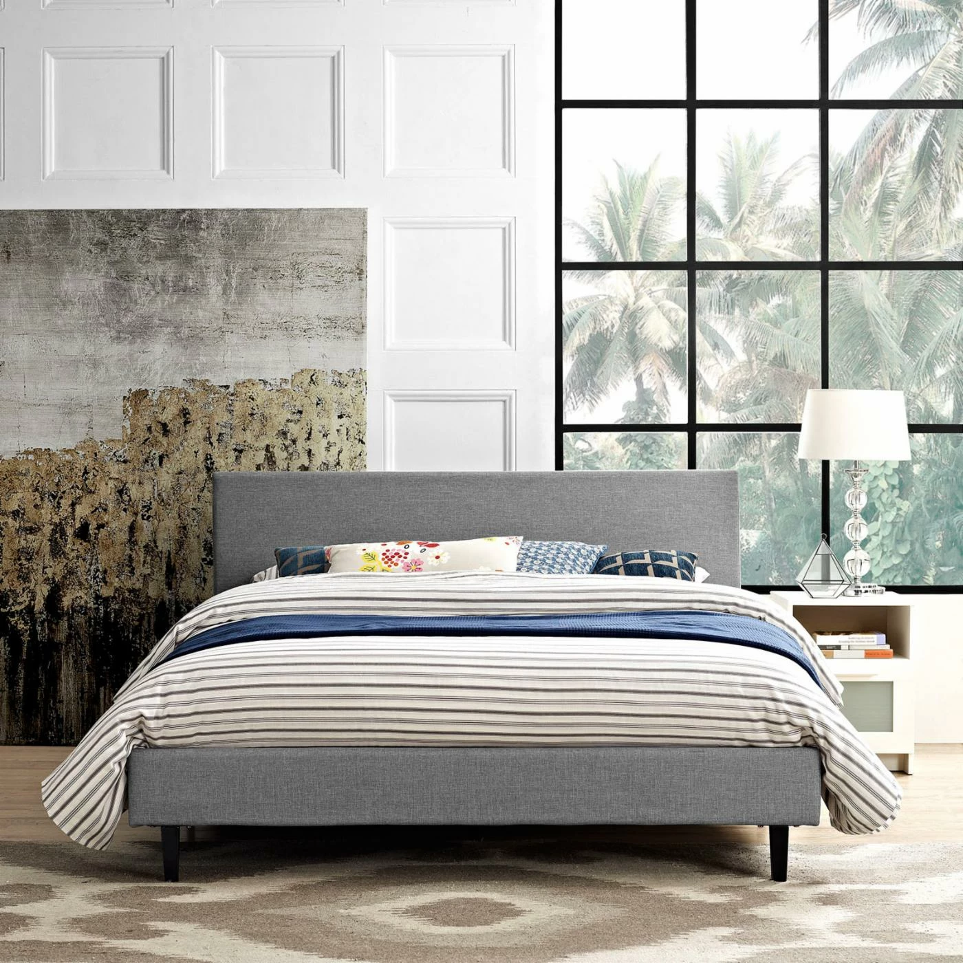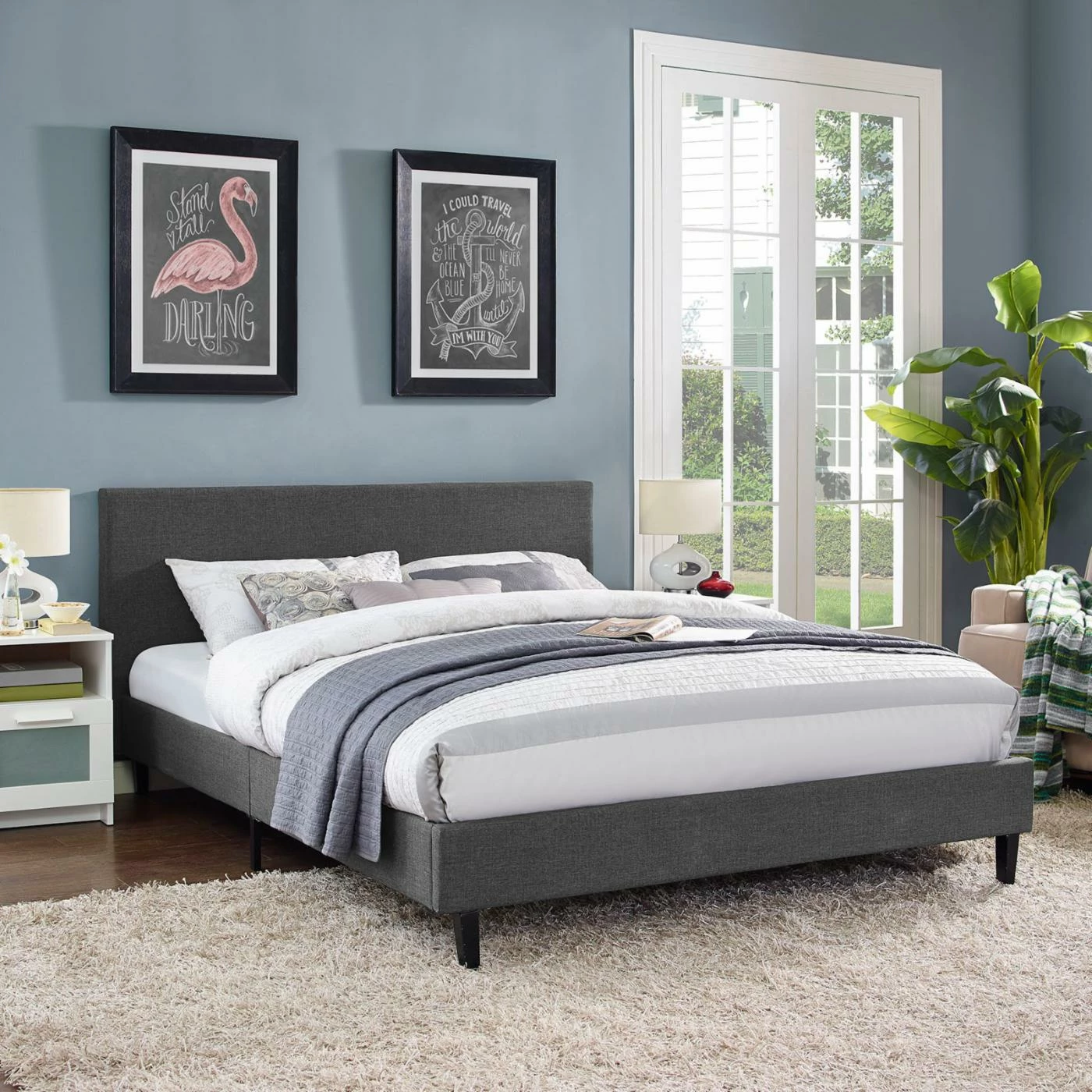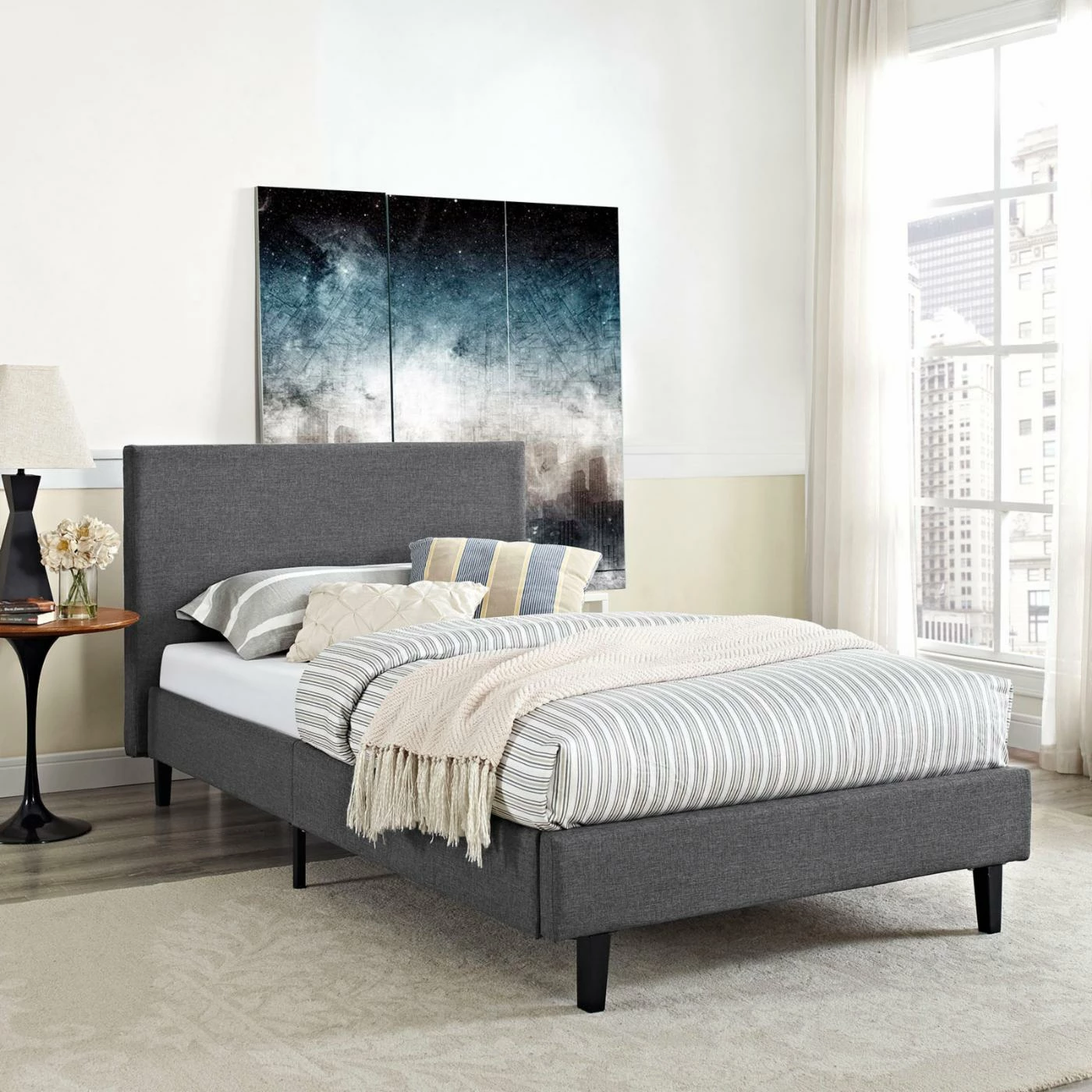Bring a bold modern aesthetic to your setting with the Modway Anya Upholstered Platform Bed. Crafted with a wood base, this bed features a slatted wood support system that easily replaces a box spring for a sleek and streamlined look. Dense cushioning ensures both comfort and support for your bed, while its clean lines brim with elegance. Non-marking foot caps help keep your floor protected from scratches and scuffs.