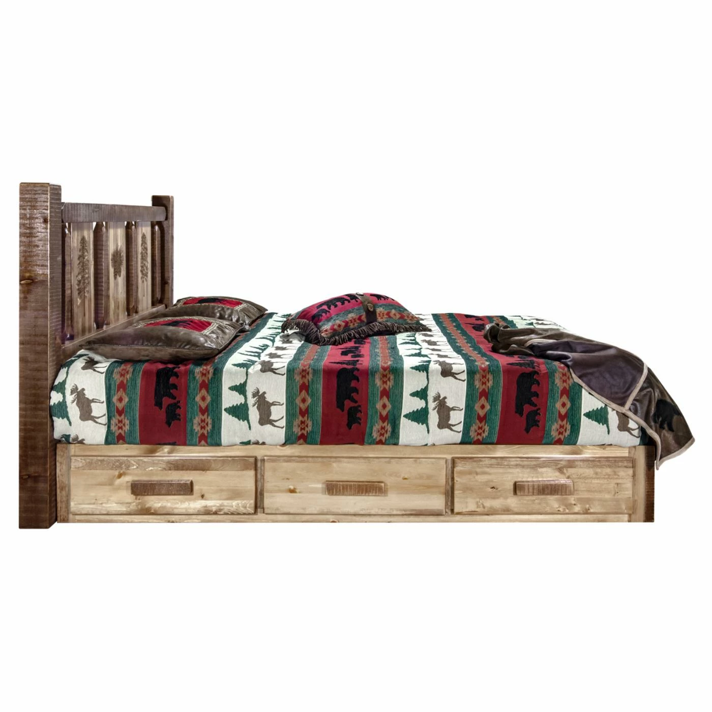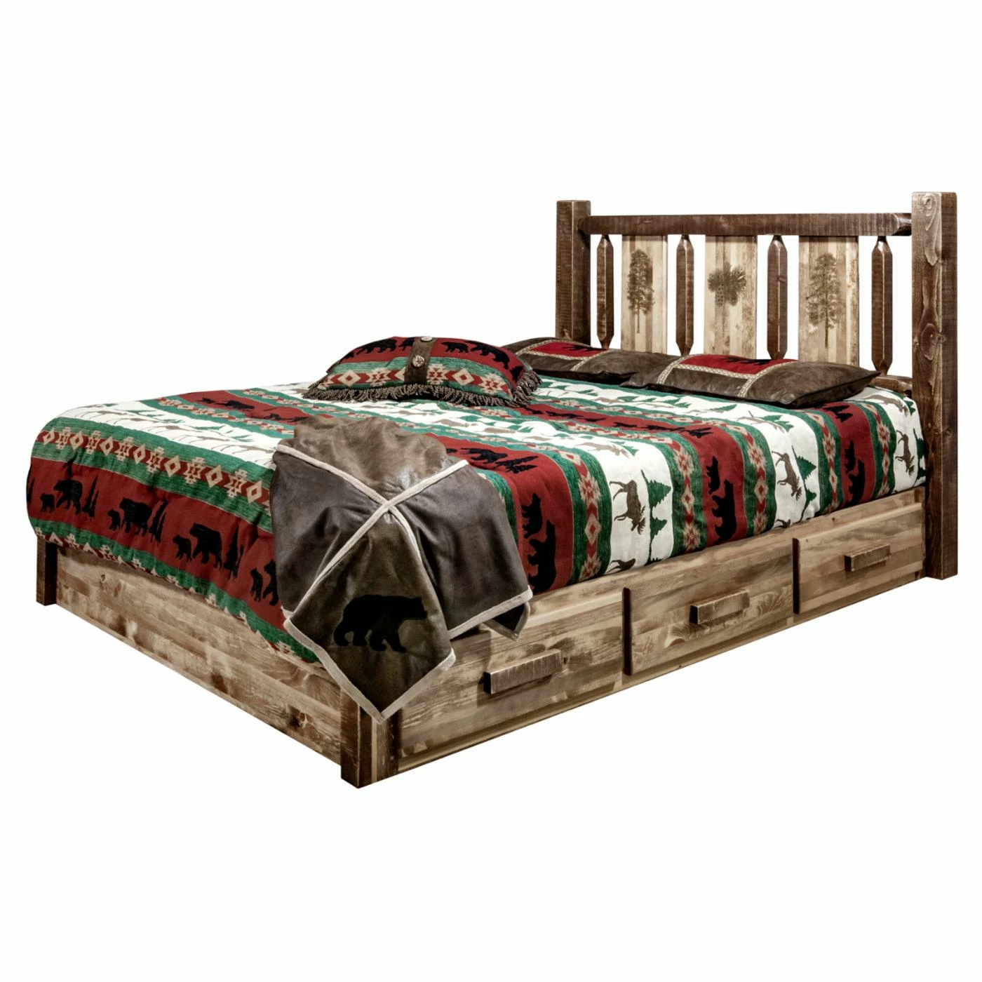 For a bedroom rich in storage and rustic lodge charm, choose the Montana Woodworks Homestead Collection Platform Bed with Storage with Laser Engraved Design. This ruggedly handsome bed is handcrafted in Montana using solid, American-grown lodge pole pine wood and is signed by the artisan who made it. A rough saw on all timber and an Early American #230 stain give this bed an American frontier look. It boasts three under-bed drawers and a platform foundation so it’s mattress-ready without the need of a box spring. Choose from available sizes.