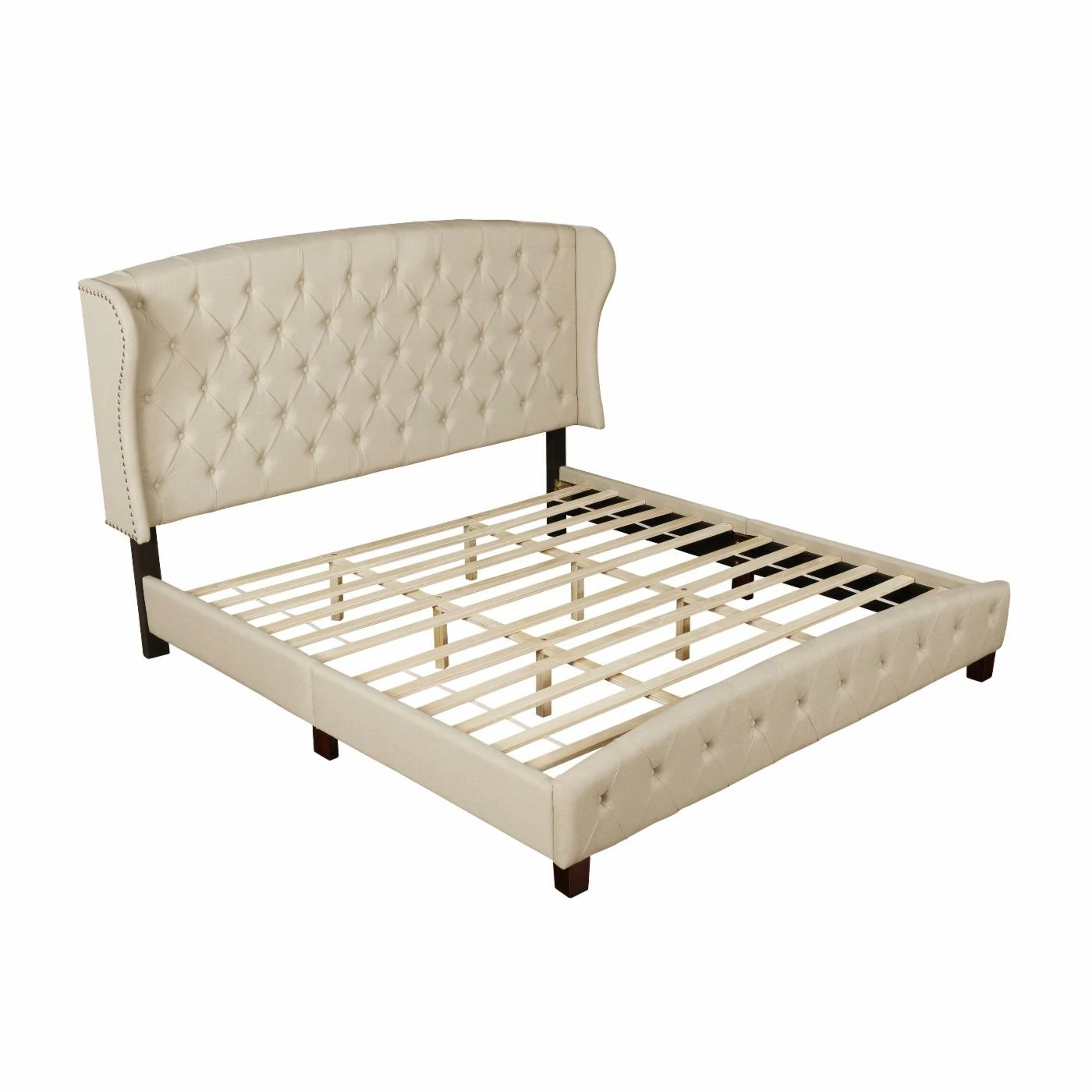Treat yourself to the classical bedroom your dreamed of as a child with the Nathaniel Home Jayce Upholstered Wingback Platform Bed. This bed has a modern platform design that needs no box spring. The headboard, however, is timeless, featuring an arched top, wingback sides, and deep diamond tufting. Durable hardwoods construct the frame, balanced on block legs. Premium fabric upholsters the piece. Choose from available size and color options to make it yours.