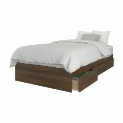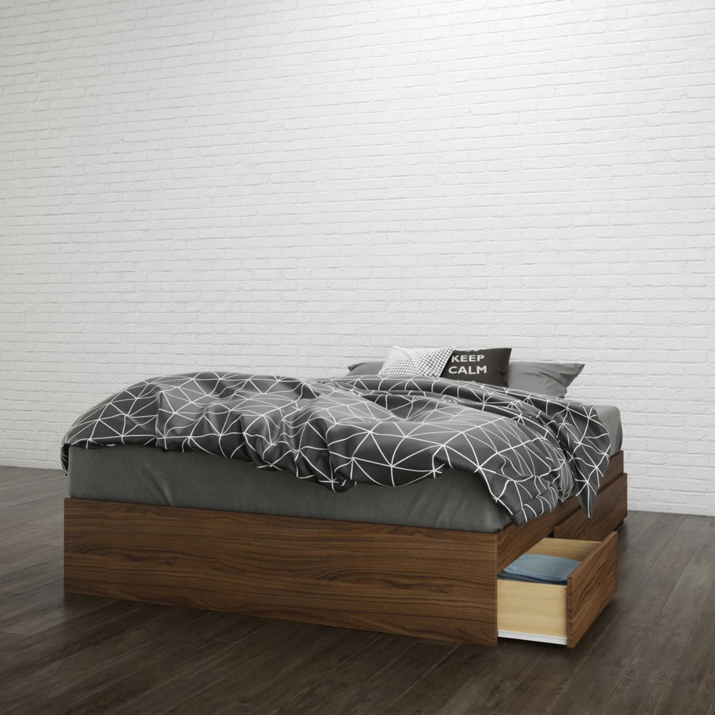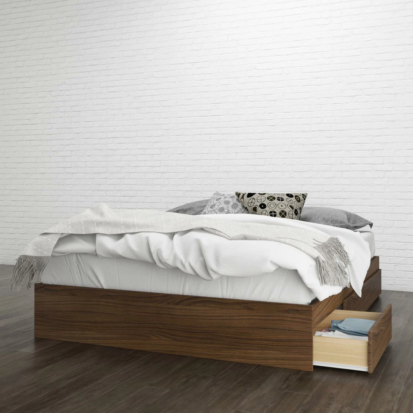 Rich walnut wood grain laminate gives this Nexera Cartel 3-Drawer Storage Bed its designer versatility. Pair this simple box frame with contemporary, eclectic, or classic linens for a look all your own. To help keep your bedroom tidy, there are three spacious drawers tucked into the base. They have side mounted glides and no pulls for a clean look. The bed frame is reversible, letting you choose which side you want to place the drawers. This storage platform bed features a hardwood slat system that replaces traditional box springs. Choose from available size options.