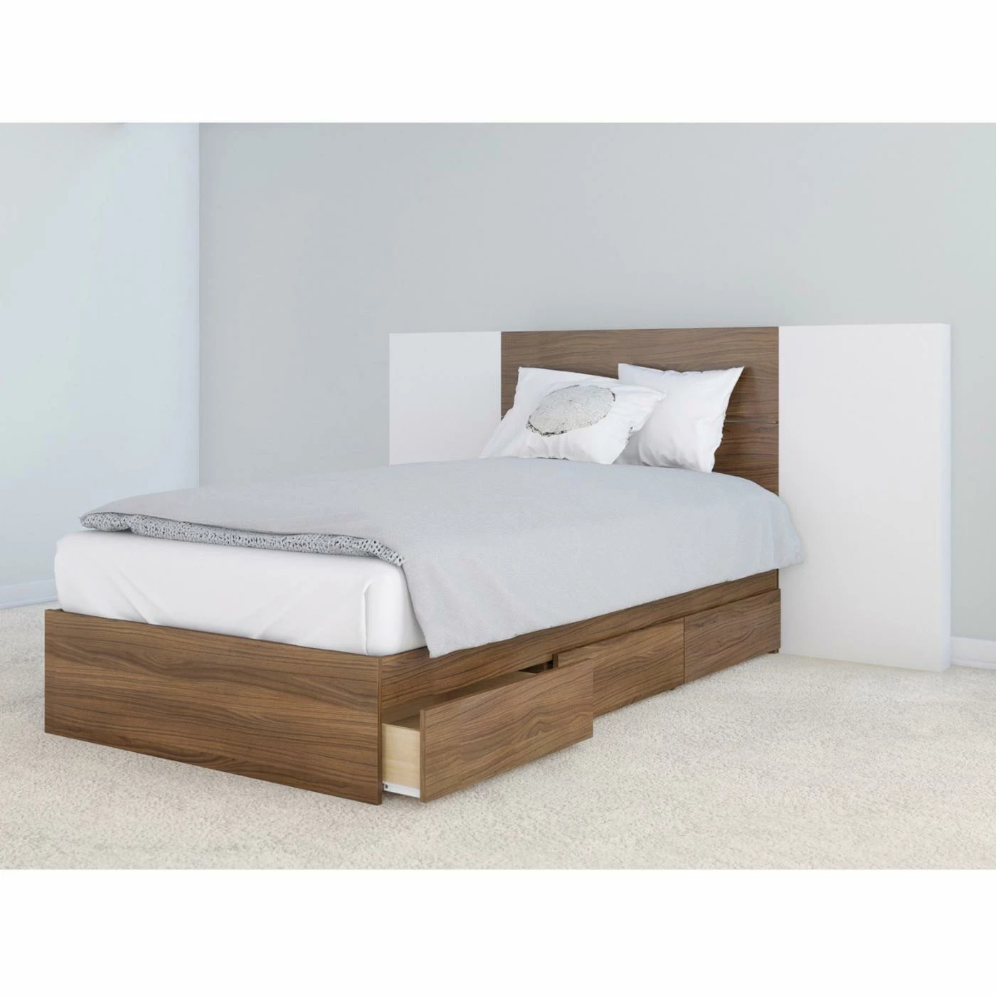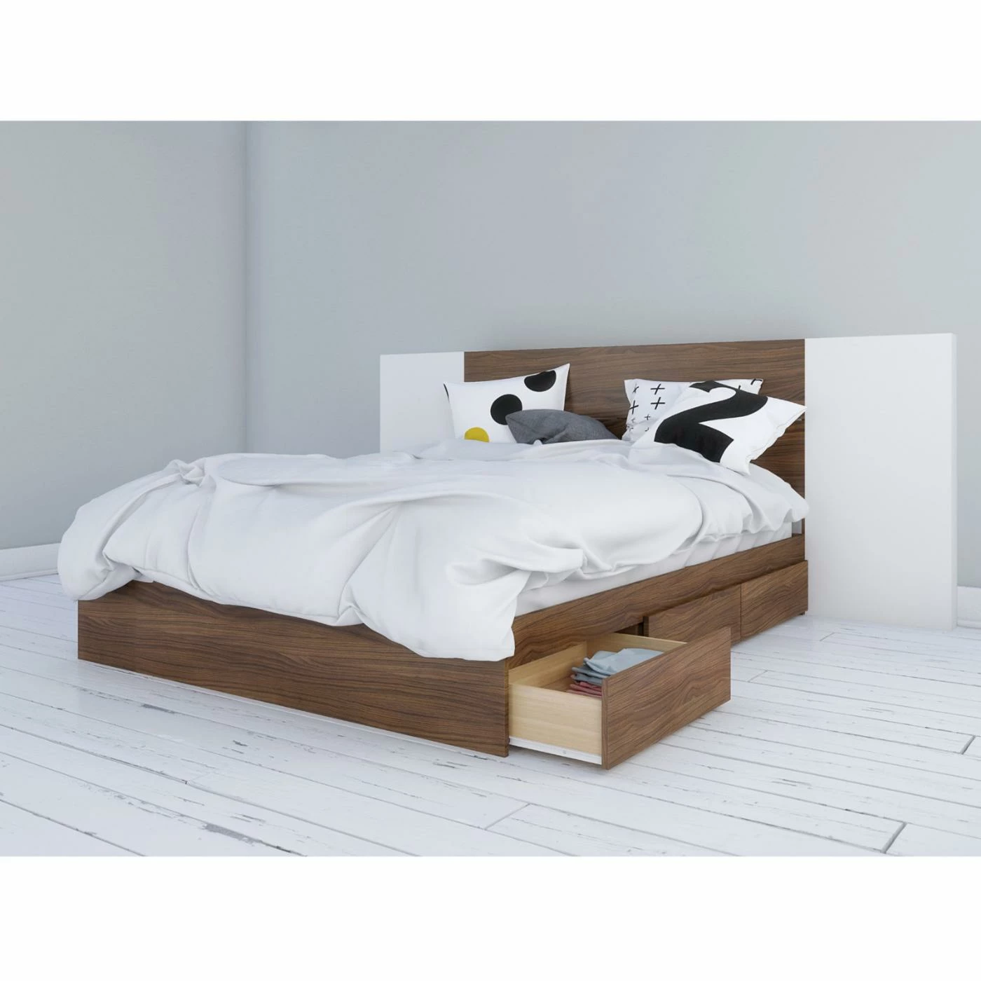The headboard extensions give the Nexera Foliage Extended Platform Storage Bed a modern flair youβll love. Finished in white melamine, the extensions accent the beauty and richness of the walnut finish on the engineered wood bed frame. Perfect for adding storage to your guest or master bedroom, this platform bed features three drawers which fit on either side of the bed. Featuring a metal and hardwood slat construction, no box spring is required.