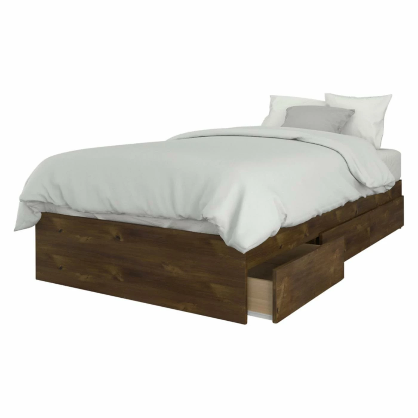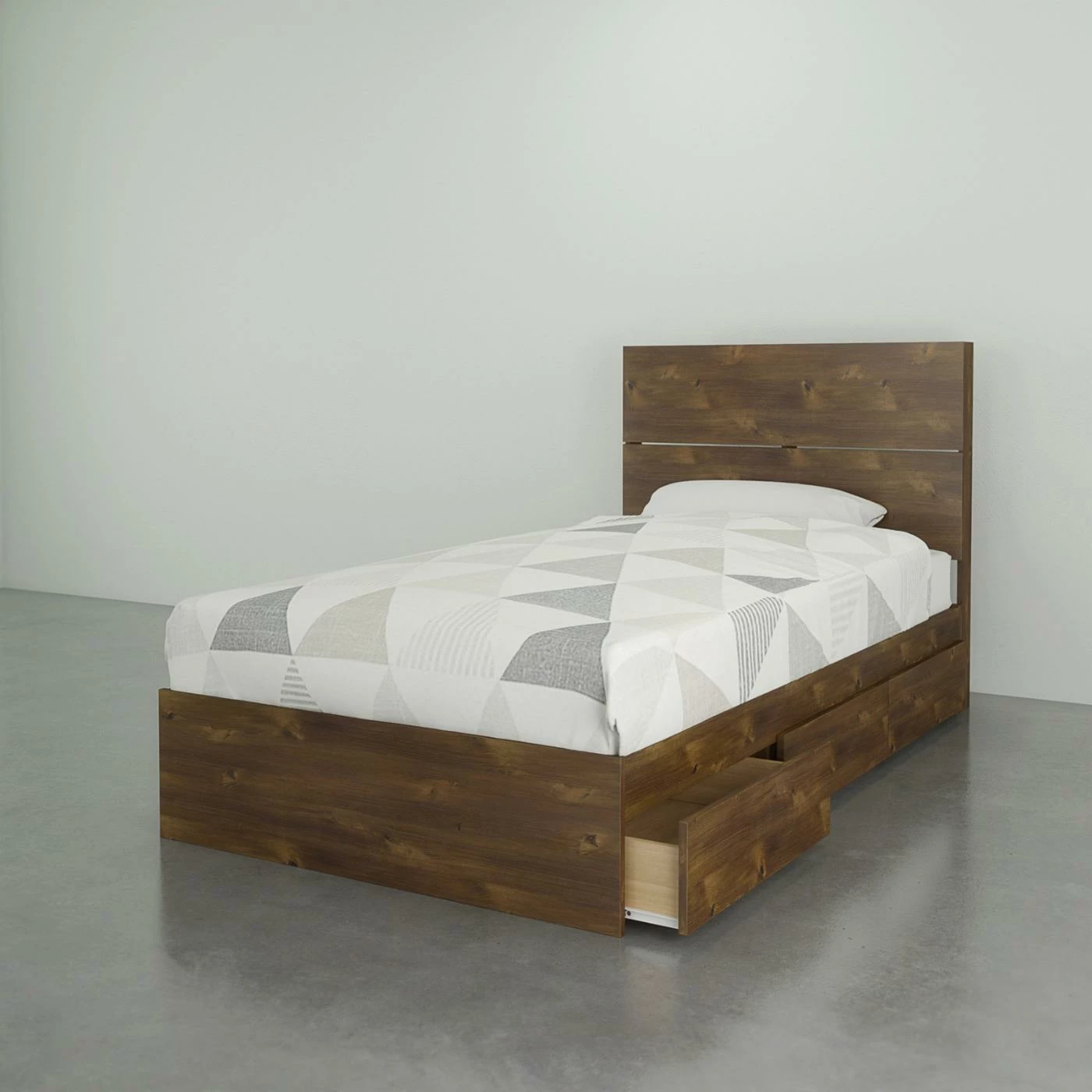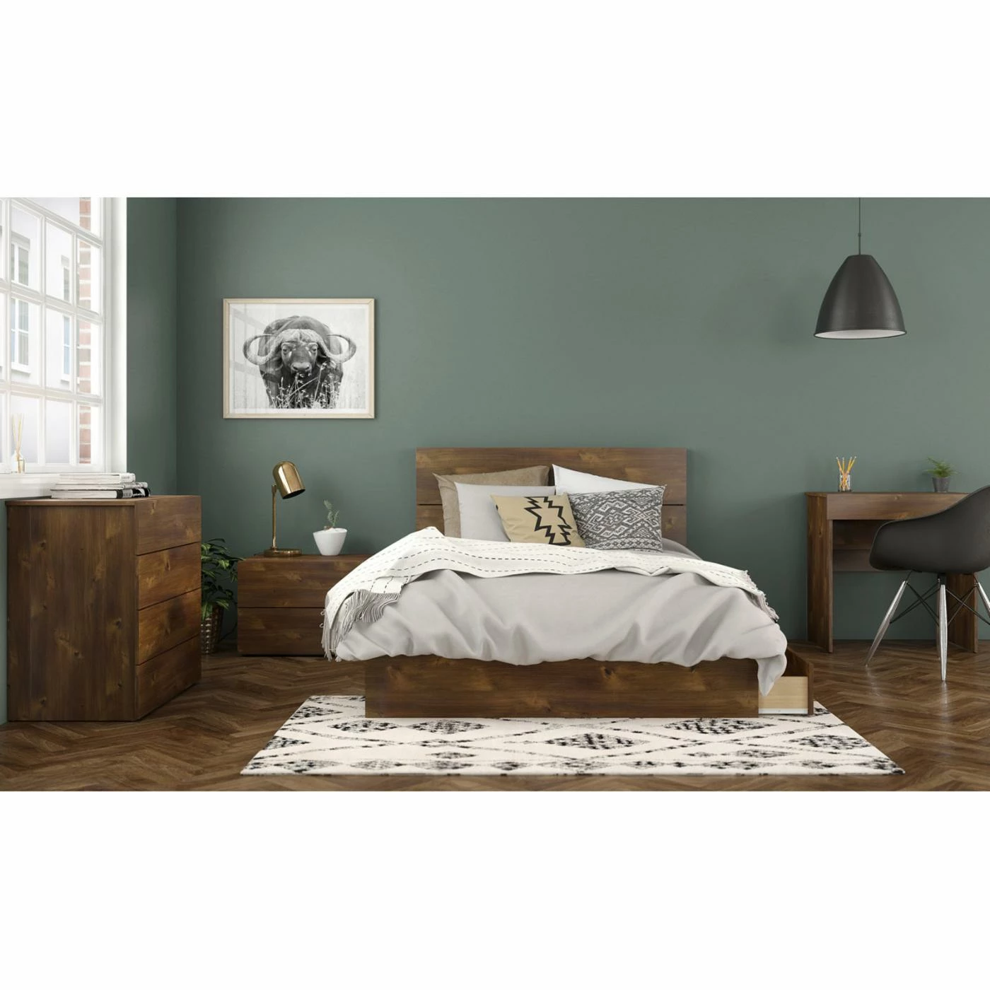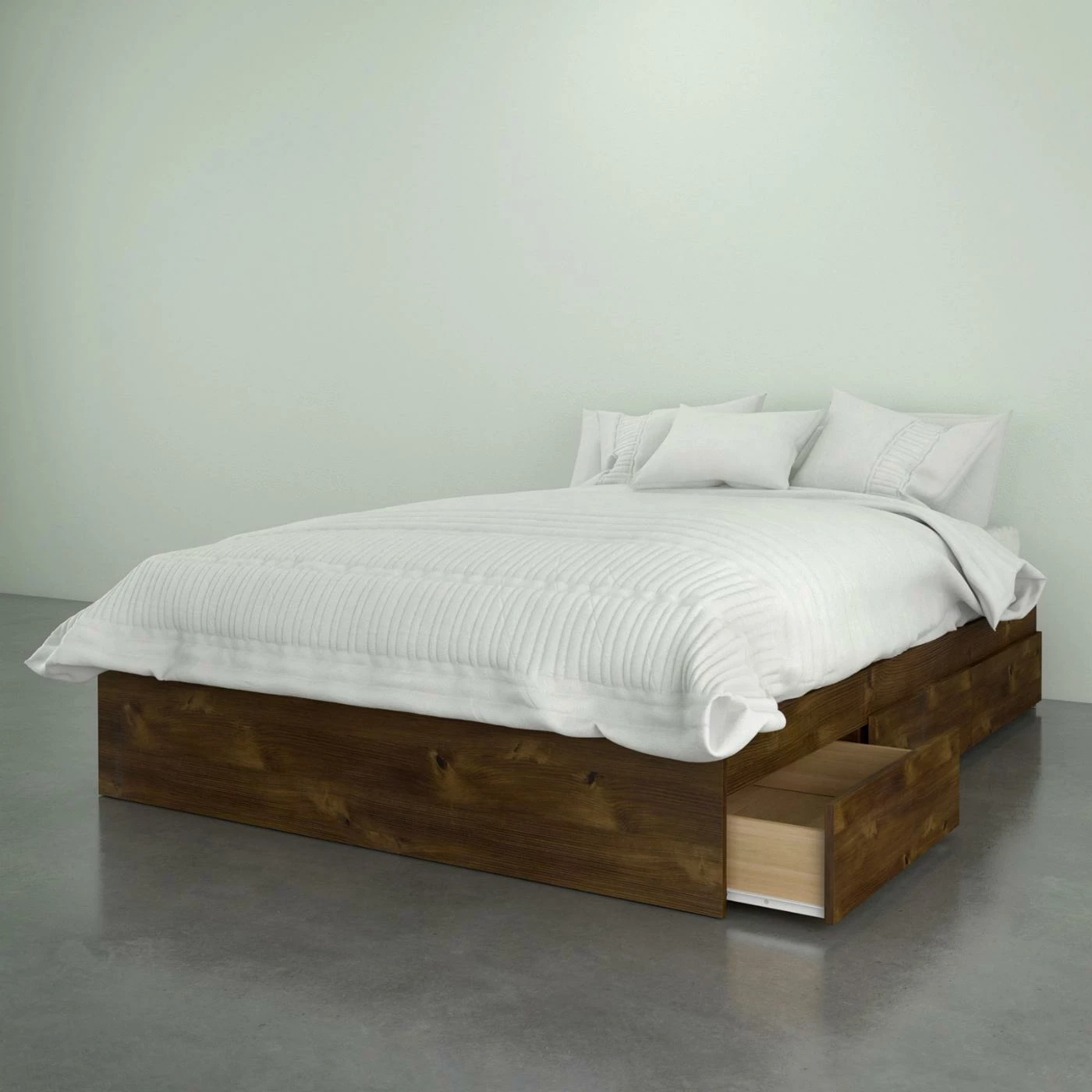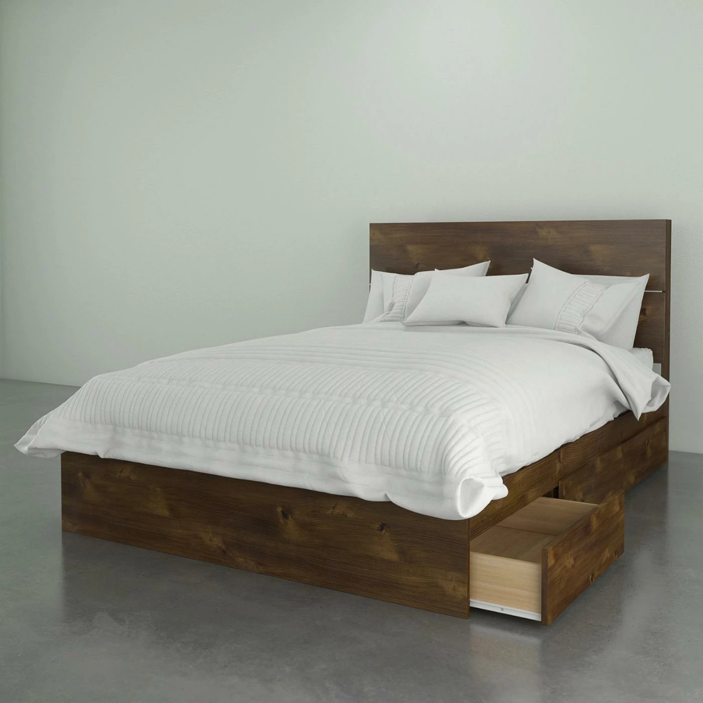 The Nexera Nocce Platform Storage Bed with Optional Headboard is the perfect choice for the minimalist in you. This platform bed is crafted from engineered wood and features a metal and hardwood construction that eliminates the need for a box spring. Three drawers, designed to fit on either side of the bed, give you extra space for clothes, blankets, sheets, and more. The truffle finish completes this modern piece and complements most homes. An optional headboard is available.