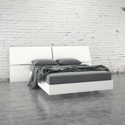 Give your bedroom the look of the future with the Nexera Panoramic Headboard and Platform Bed. The platform design creates the illusion of a floating bedframe. Minimalistic style is achieved through a sleek boxy frame and white melamine finish. The headboard creates a smooth modern backdrop for your bed with rectangular panels that are slightly angled to draw the eye. This bed is made from metal and hardwood slats to distribute your weight and create the most comfortable night’s sleep. This contemporary piece comes in your choice of available sizes.