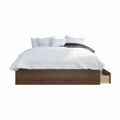 The sleek, modern style of the Nexera Rebel Panoramic Platform Storage Bed with Nightstand instantly elevates your space. Designed to complement most color schemes, this set features a walnut laminate finish and an accenting charcoal finish on the nightstand drawer front. Its metal and hardwood slat construction removes the need for a box spring while the laminate and engineered wood construction ensures itβll last. This set includes three drawers, which can be installed on either side of the bed, to hold clothes and blankets. With the included nightstand, which has a single drawer and open shelf for storage, and with your choice of available sizes, this bedroom set is a perfect addition to your master or guest bedroom.