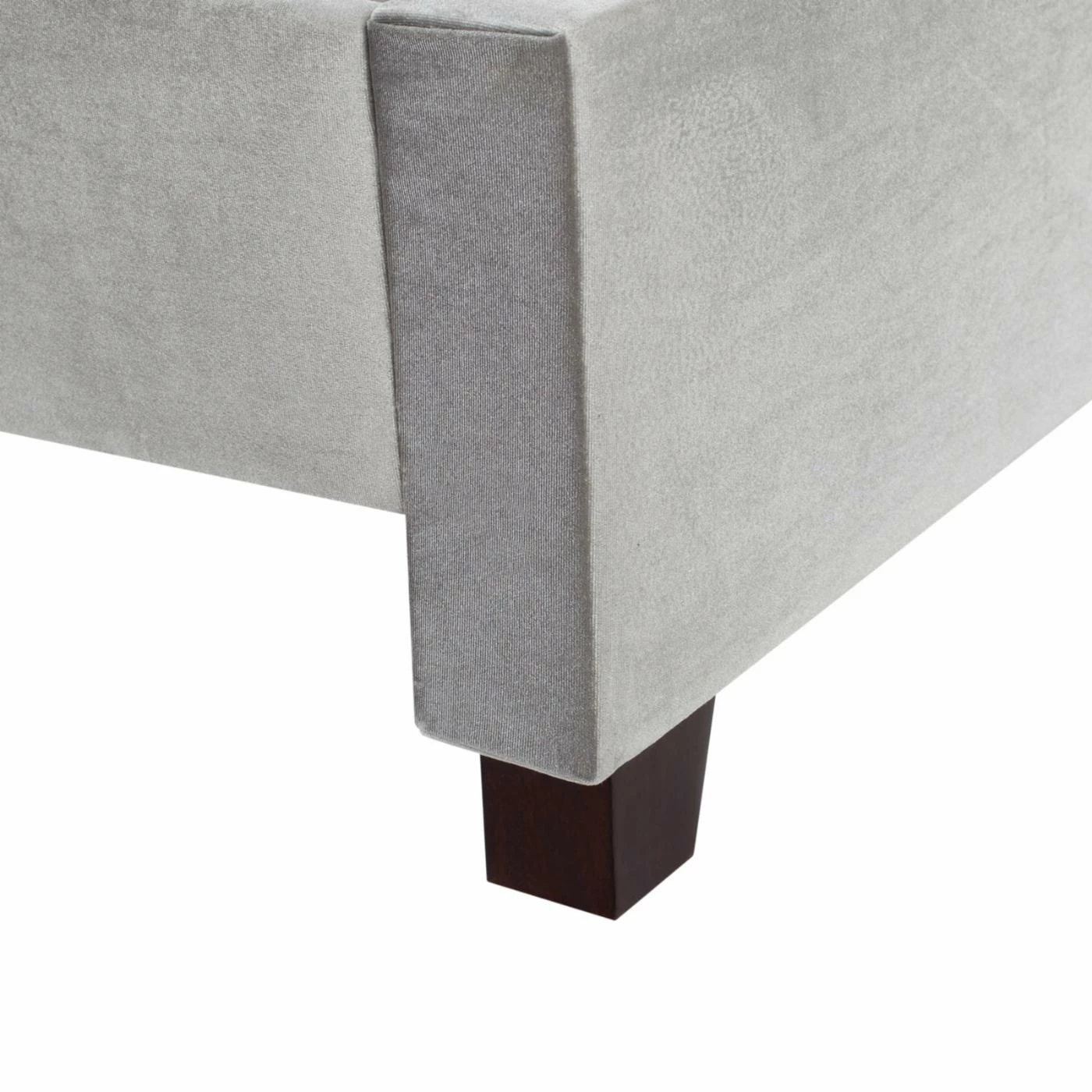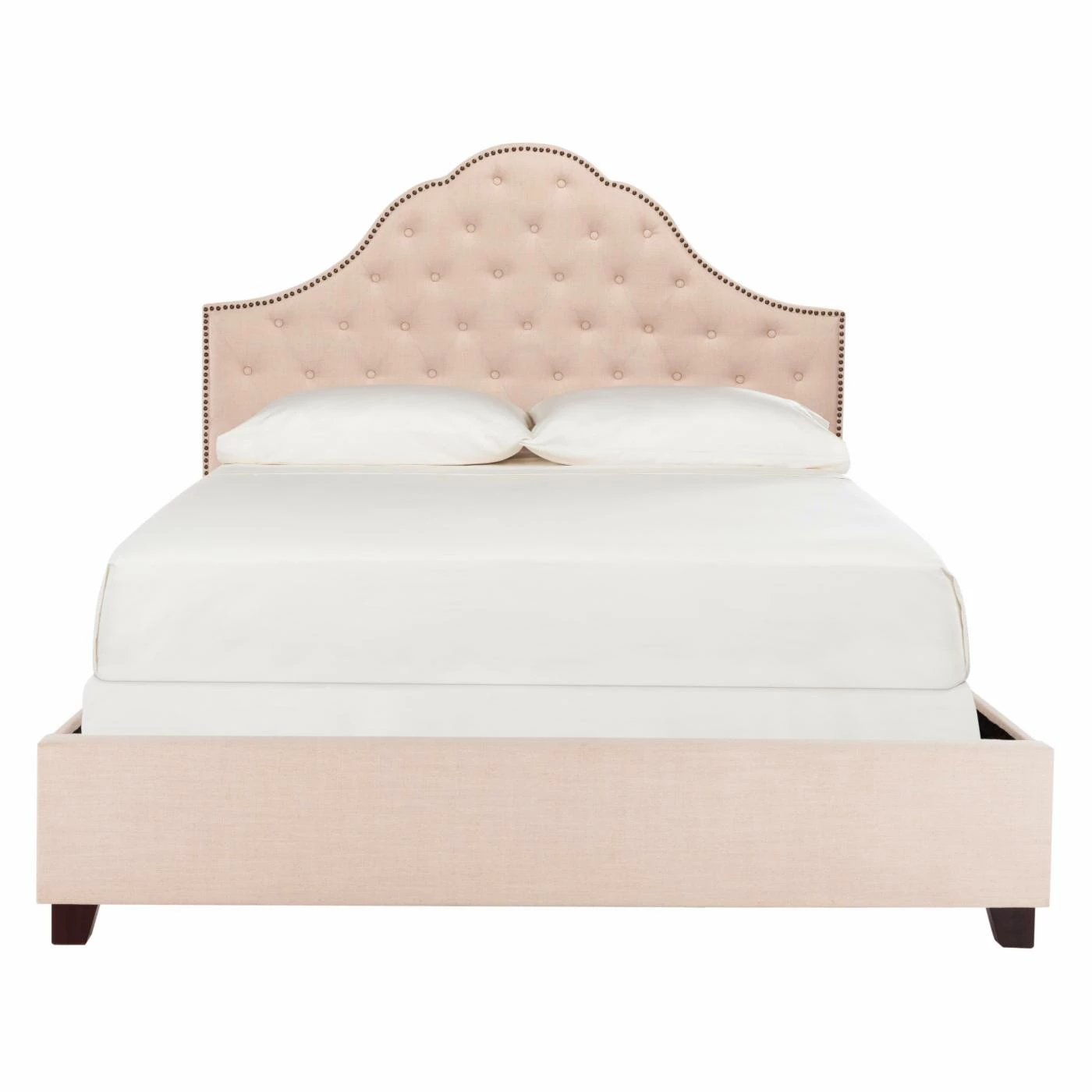 The Safavieh Beckham Upholstered Panel Bed is covered from top to bottom with a solid-color fabric. It has an arched headboard with diamond tufting and polished nailhead trim. The base is designed with clean lines and has intersecting panels that create a neat border around your bedding. Plus, this bed is supported by sturdy engineered wood legs with a dark, sophisticated finish.