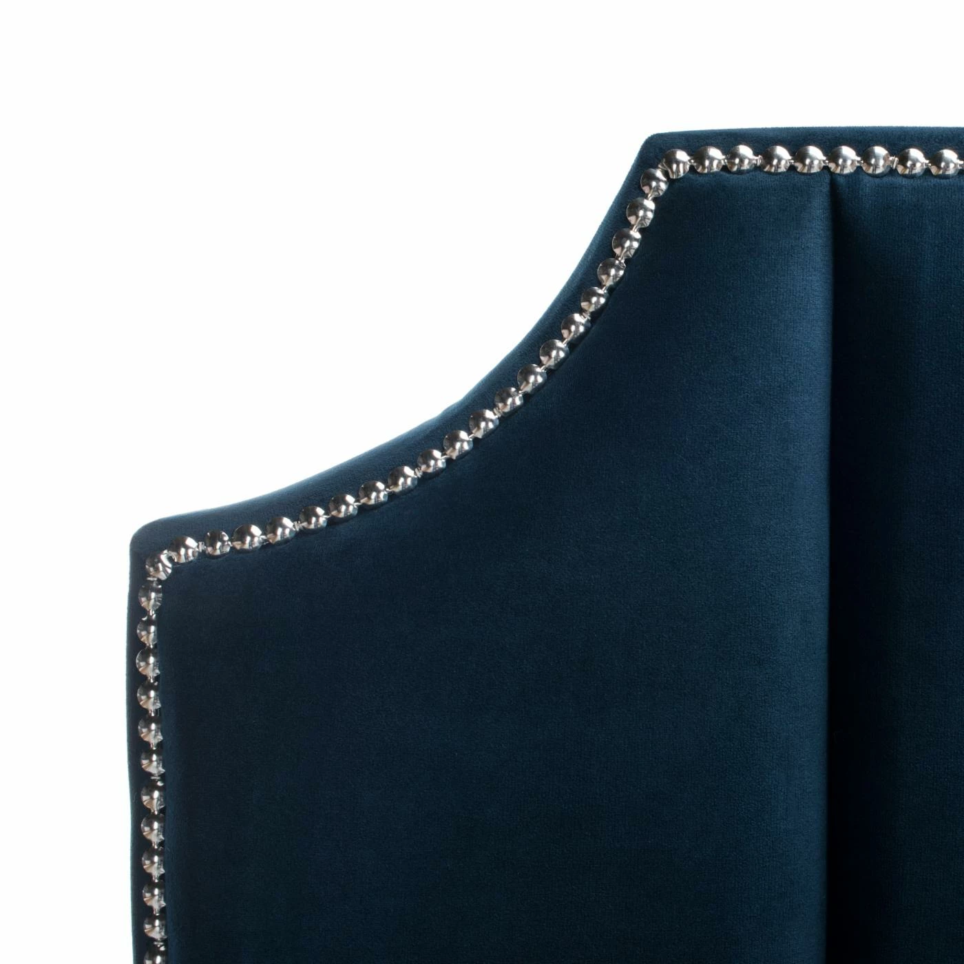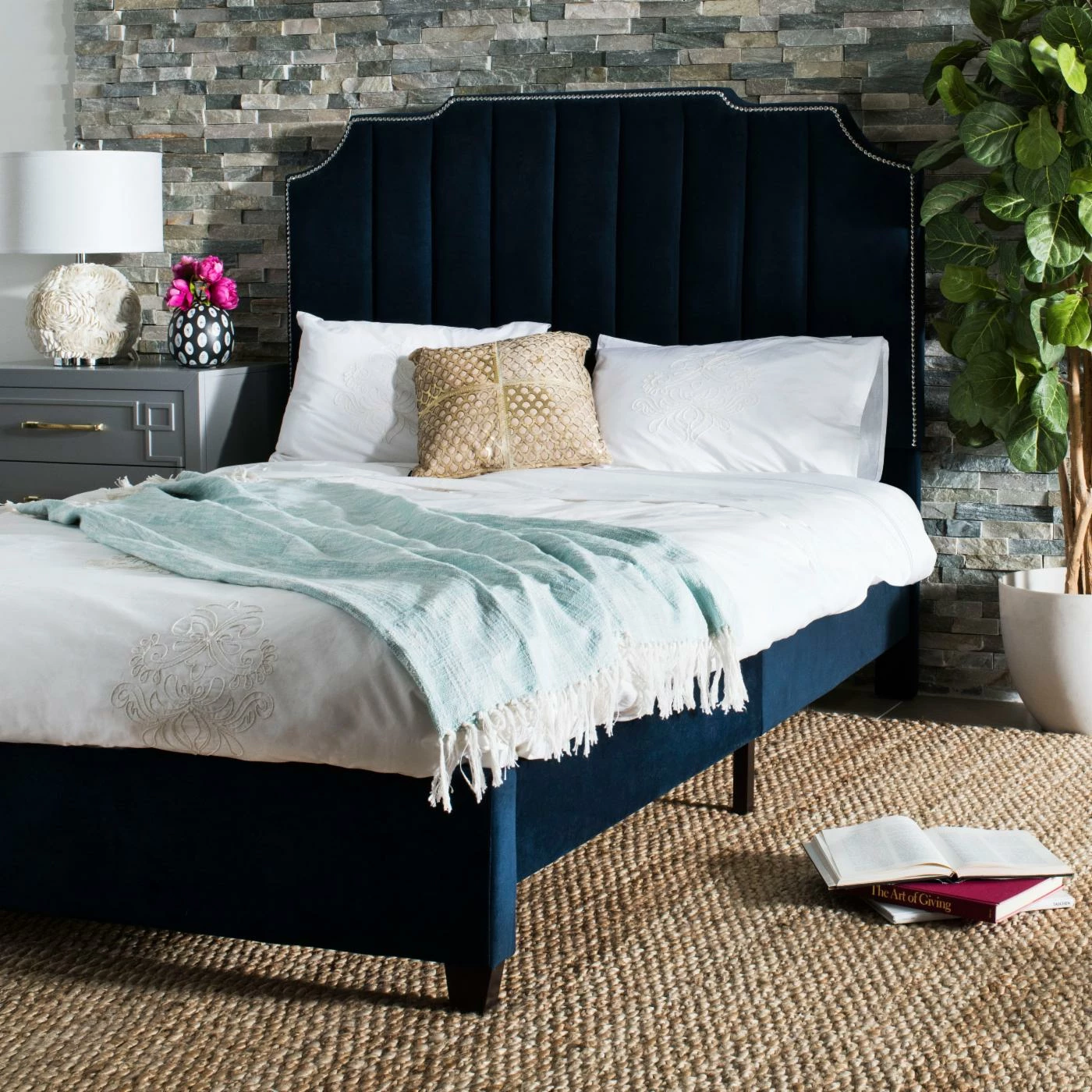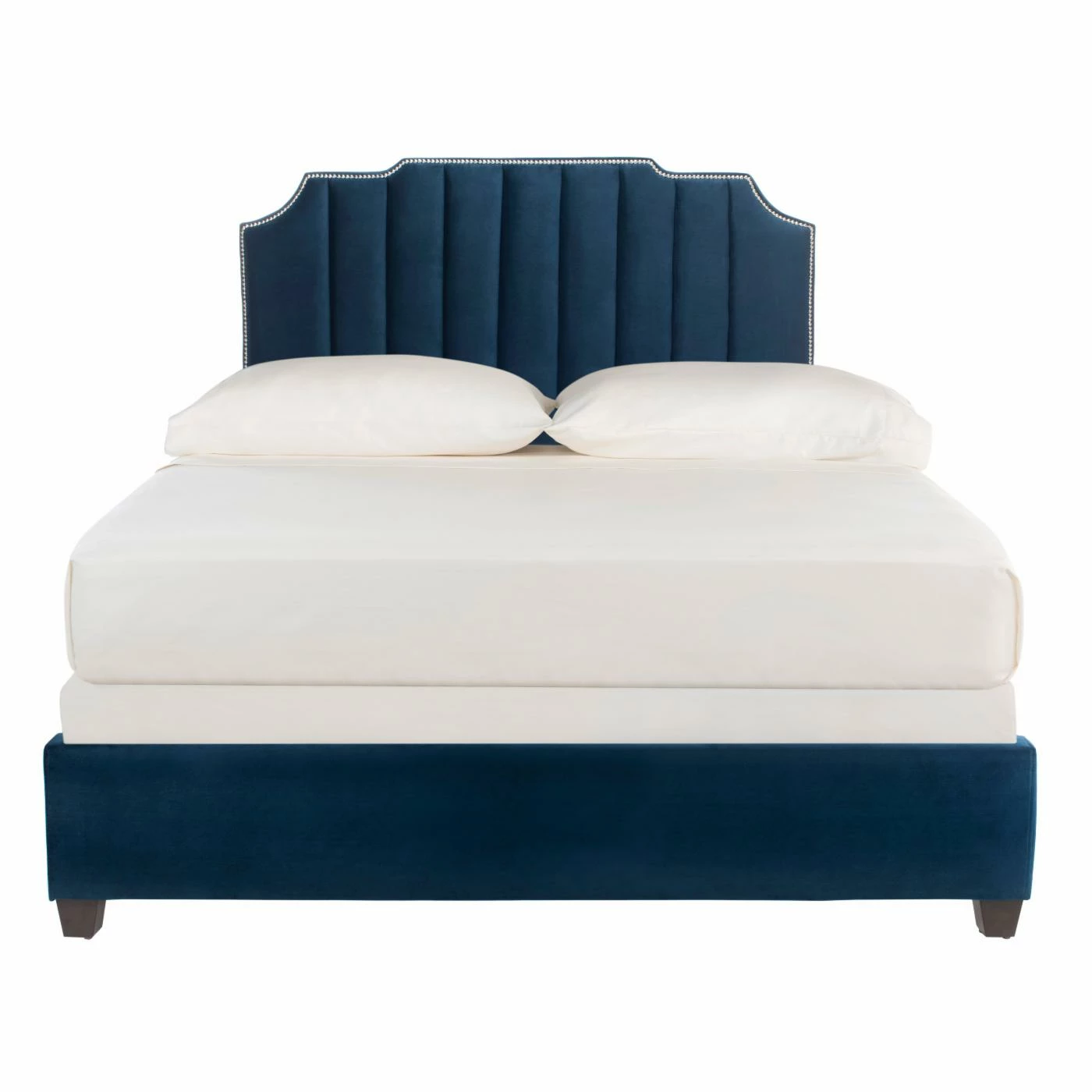 Create a stunning and luxurious bedroom with the Safavieh Streep Panel Bed. Featuring plush, velvet upholstery in your choice of available colors, channel tufting on the headboard, and a polished nickel nailhead border, this bed elevates the style of any bedroom. Its durable wood frame and choice of available sizes makes it perfect for guest and master bedrooms alike.