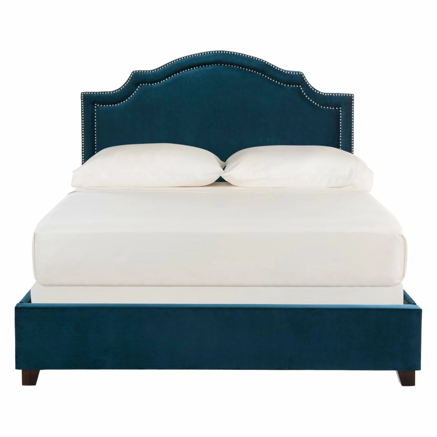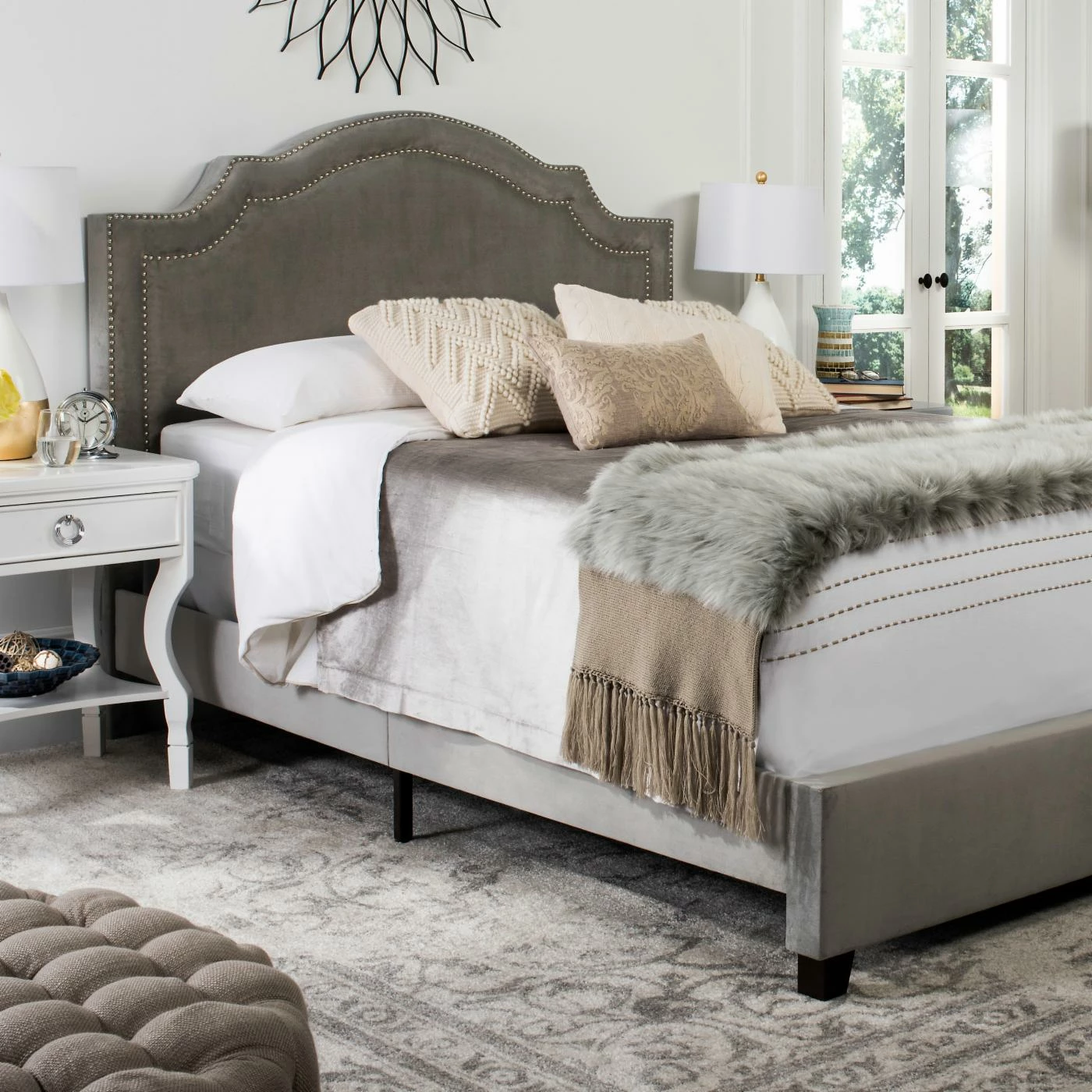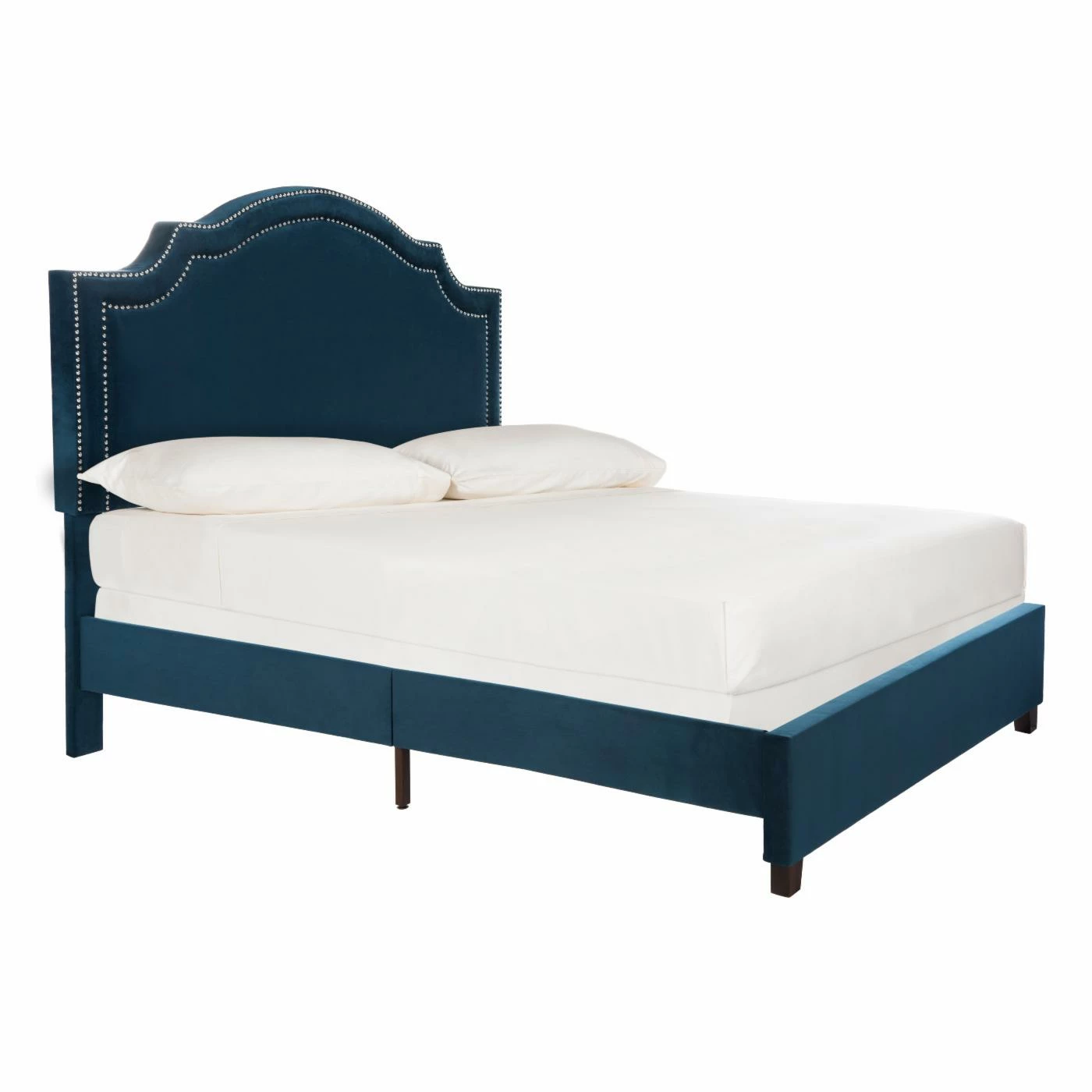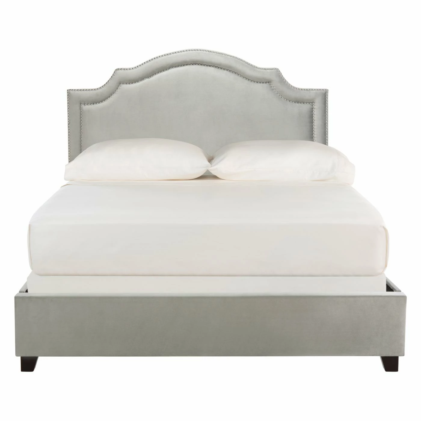 With soft curves and refined detail, the Safavieh Theron Queen Bed adds modern elegance to any style bedroom. This platform bed is sturdily constructed from iron and stainless steel, and is covered in durable fabric upholstery. The graceful, arched-style headboard features gleaming nailhead trim for a sophisticated finish to this chic queen-size bed.