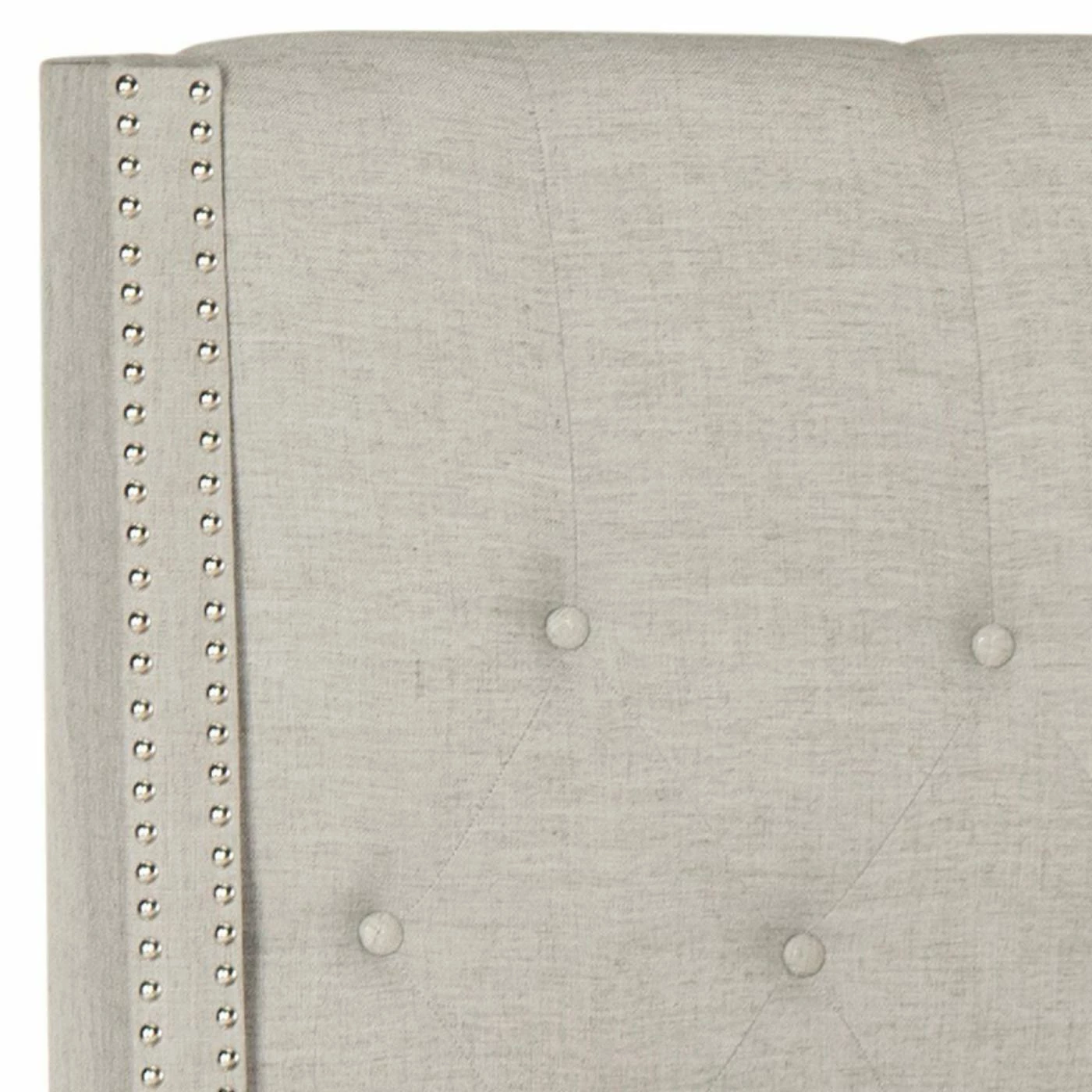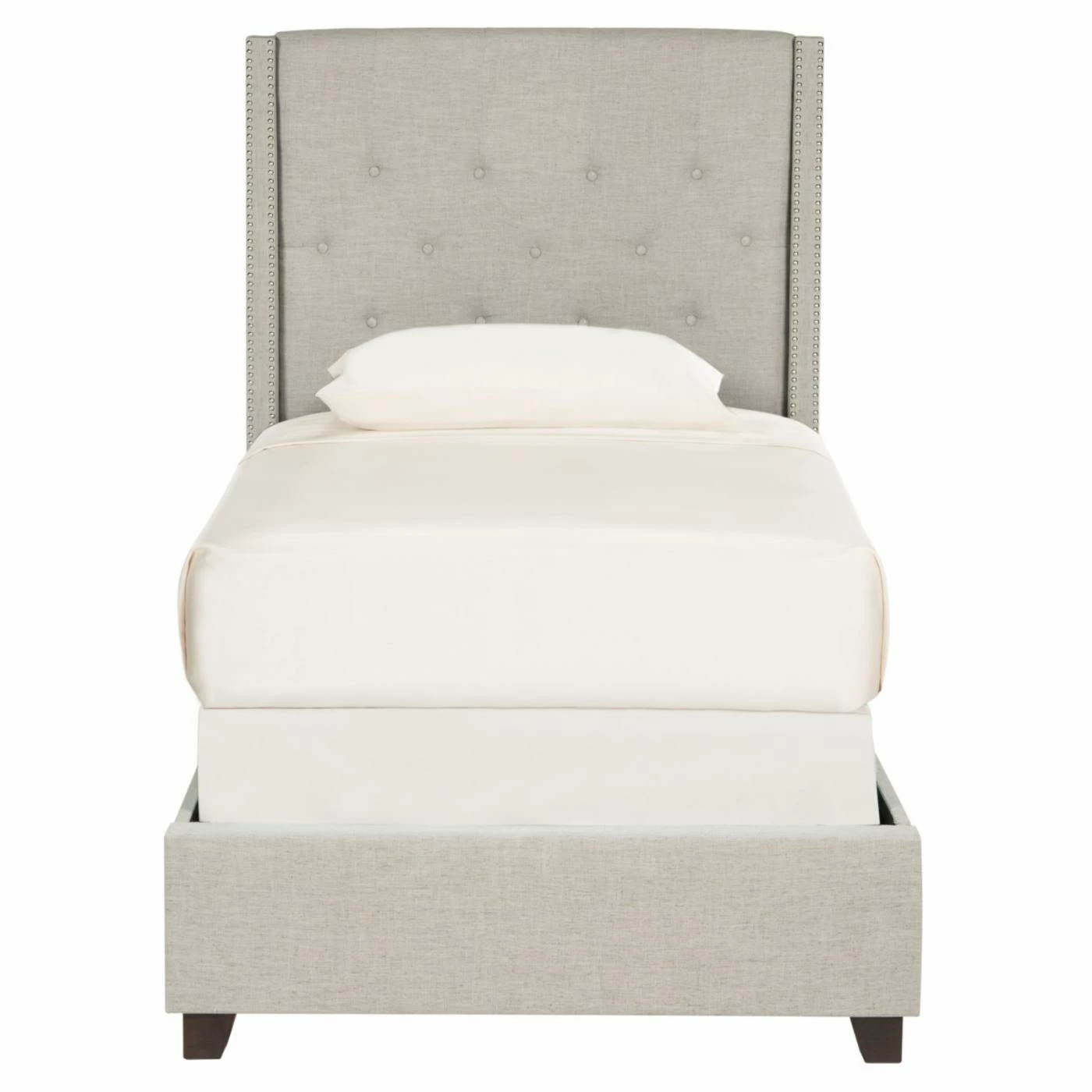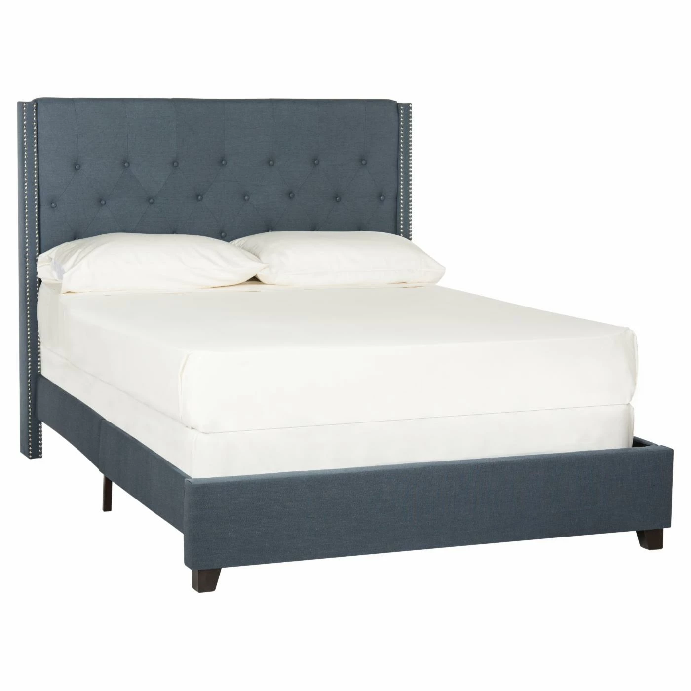 The Safavieh Winslet Wingback Upholstered Platform Bed naturally draws the eye, making it a simple, clean centerpiece for transitional or modern rooms alike. This wide, beautiful platform bed is supported by a frame made from plywood and rubberwood solid and is upholstered in a plush linen (in your choice of available color). The wide headboard features an angular wingback design with a padded, diamond-tufted face and nailhead trim on the wings. A slat platform supports your mattress, removing the need for a box spring.