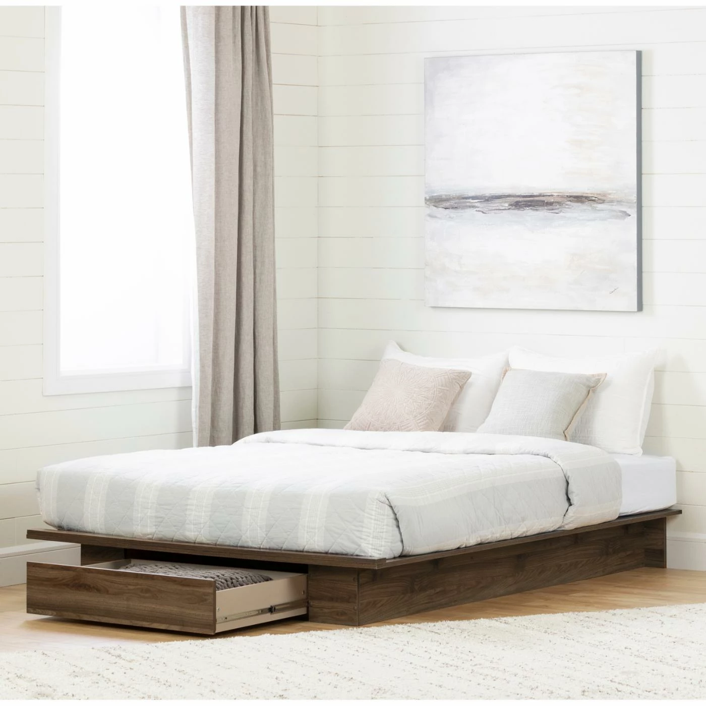The South Shore Tao Underbed Storage Platform Bed eliminates the need for a box spring with its sleek, contemporary design. This platform bed is crafted from a durable, laminated engineered wood and boasts a walnut finish. With its single hidden drawer at the foot of the frame, this bed offers ample space to store bedding or even seasonal clothing items. With its versatile style, this platform bed promises to pair with multiple decorative looks like a dream.