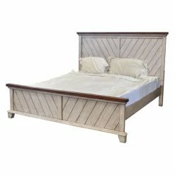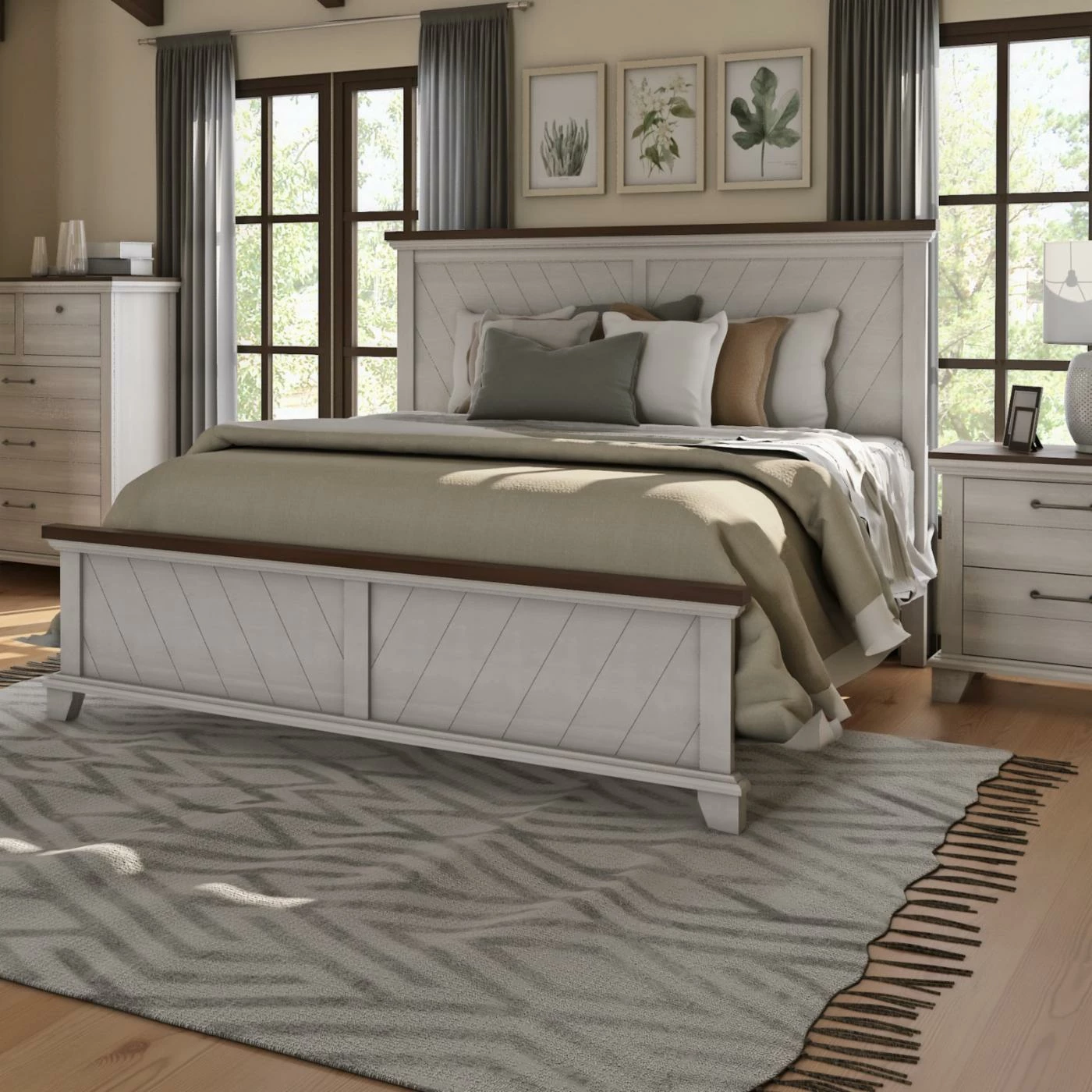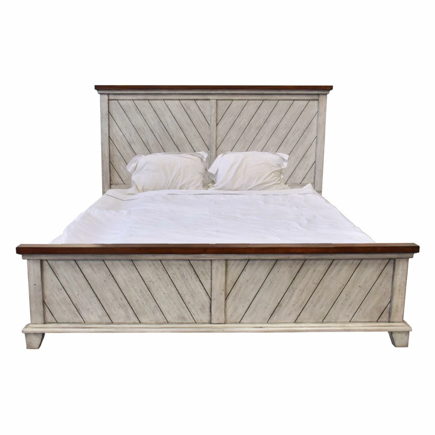 Wide wood planks in a chevron pattern and a weathered two-tone finish give the Steve Silver Co. Bear Creek Panel Bed its rugged farmhouse charm. This panel bed is scaled large, ensuring it will be the centerpiece of your bedroom. Featuring well-crafted acacia wood and Mindi veneers in a white smoke finish accented by thick cap rails in a contrasting honey smoke stain. Choose from available sizes.