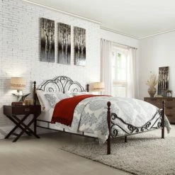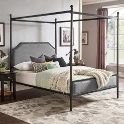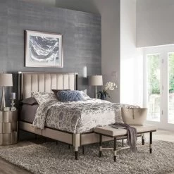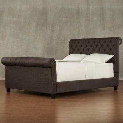 Drift into dreamland atop the Weston Home Fillmore Diamond-Tufted Rolled Top Bed. This queen-sized bed will make you feel like royalty every time you go to sleep. Button tufting details on the headboard add a luxurious look to the soft linen upholstery. The sides and foot of the bed are wrapped in the same fabric for a cohesive look. Bedrooms craving some classic appeal will look great with this rolled top addition. Dark espresso feet support this bedframe. Pair with neutral dΓ©cor or rich, romantic colors. Some assembly required.
