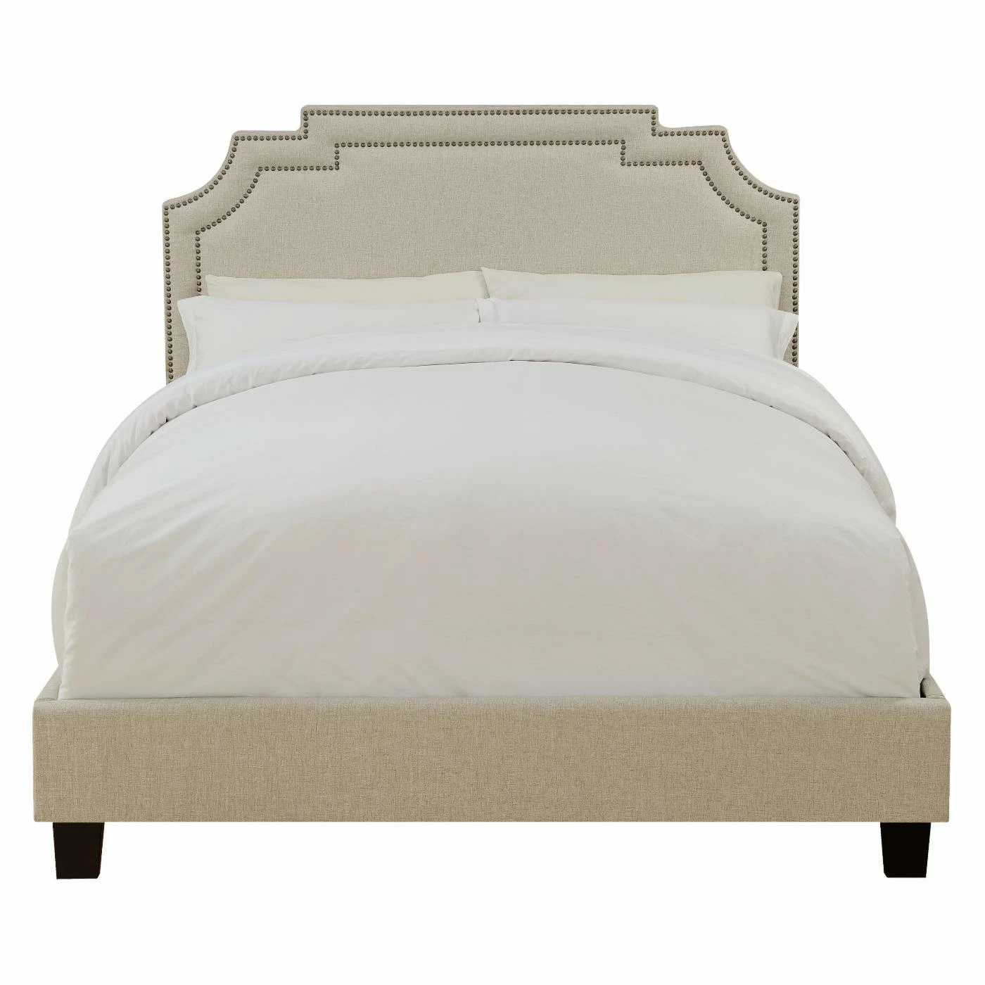The Right2Home Tiered Clipped Corner Upholstered Queen Bed adds a glamorous touch to your bedroom. It features a tiered headboard with brushed nickel nailhead trim and comes upholstered in cream polyester fabric. Adjust the headboard to accommodate a range of mattress and box spring heights.