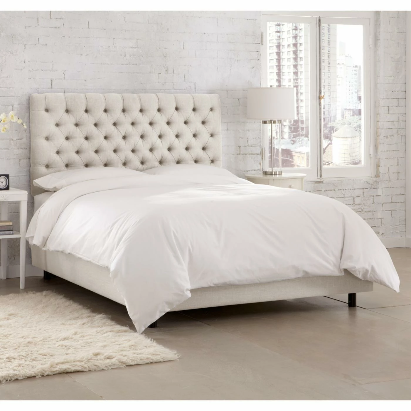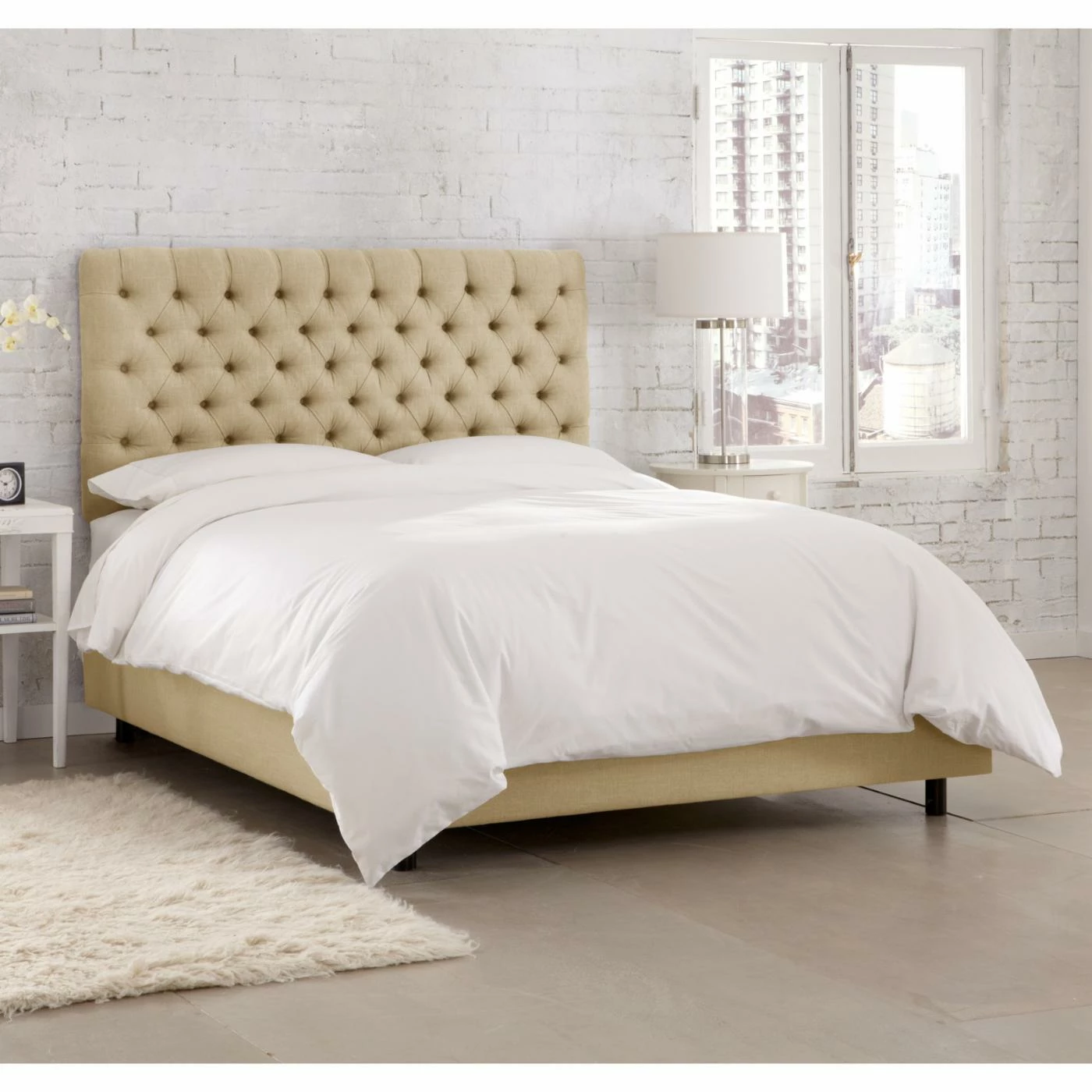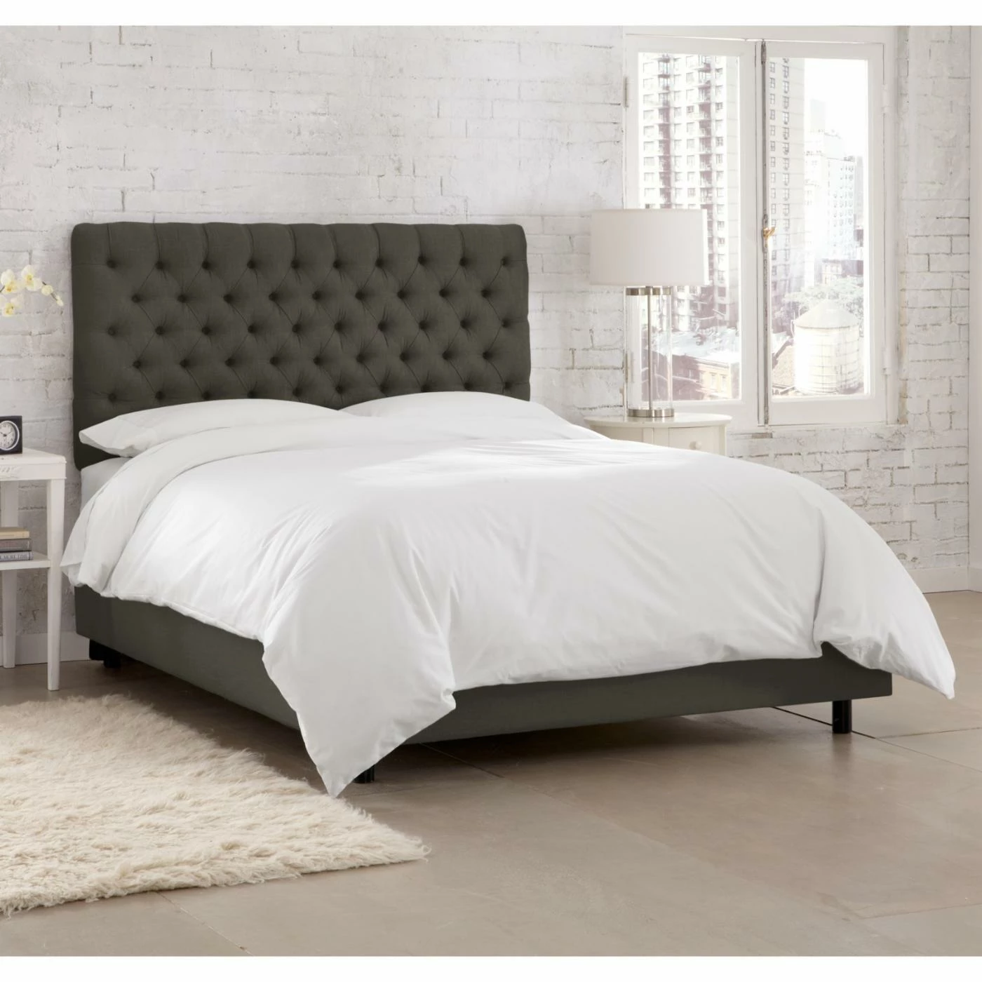 In the realm of design, simplicity is the supreme virtue. The Skyline Diamond Tufted Linen Upholstered Panel Bed has it in abundance, with a crisp, linear silhouette and a low upholstered footboard to match the headboard and rails. Linen/viscose fabric looks and feels royal. Diamond button tufting adds nuance and presents a classic appearance that plays well with almost any dΓ©cor style. A metal frame is included; a box spring foundation is required. Manufactured in Illinois.