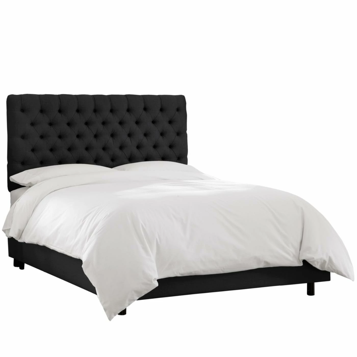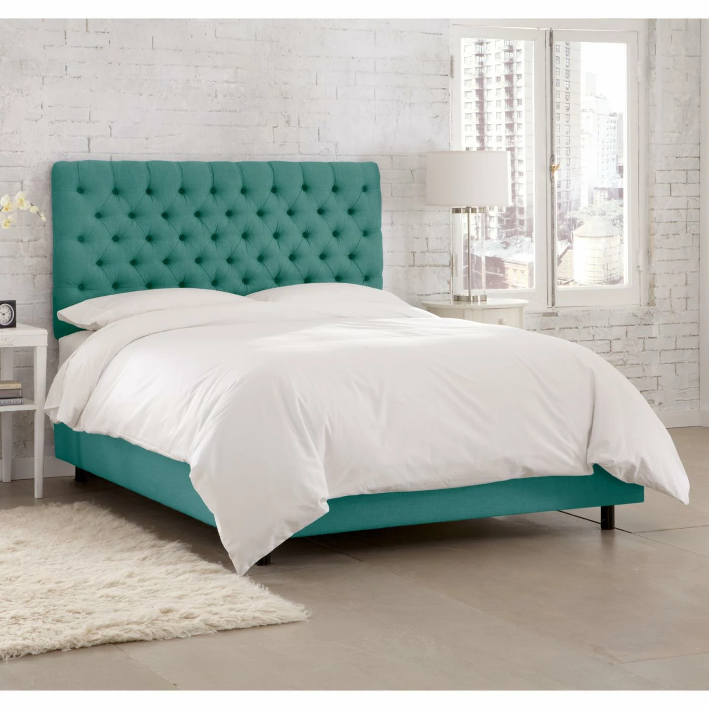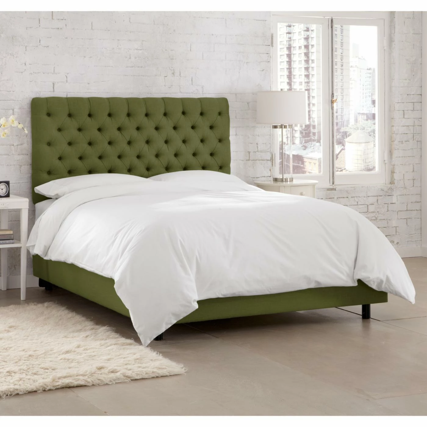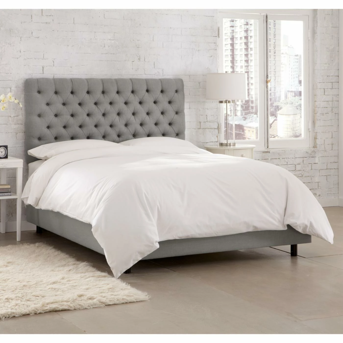 In the realm of design, simplicity is the supreme virtue. The Skyline Diamond Tufted Linen Upholstered Panel Bed has it in abundance, with a crisp, linear silhouette and a low upholstered footboard to match the headboard and rails. Linen/viscose fabric looks and feels royal. Diamond button tufting adds nuance and presents a classic appearance that plays well with almost any dΓ©cor style. A metal frame is included; a box spring foundation is required. Manufactured in Illinois.