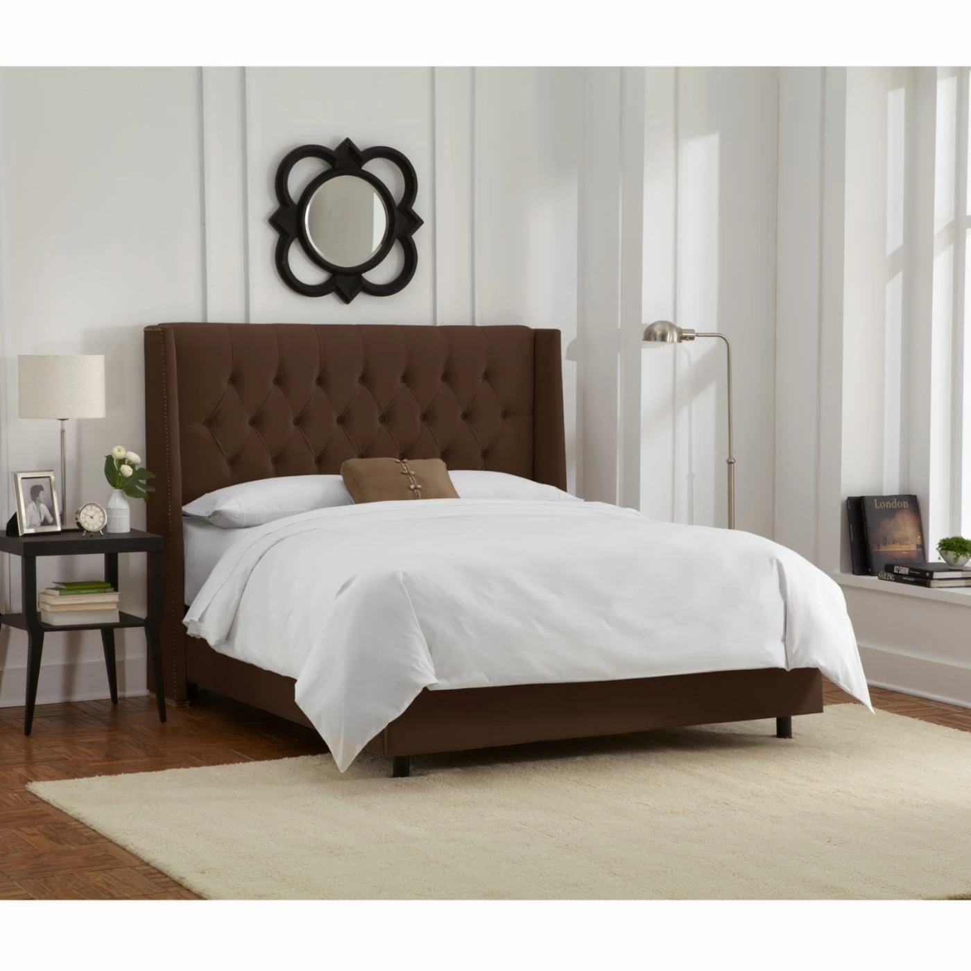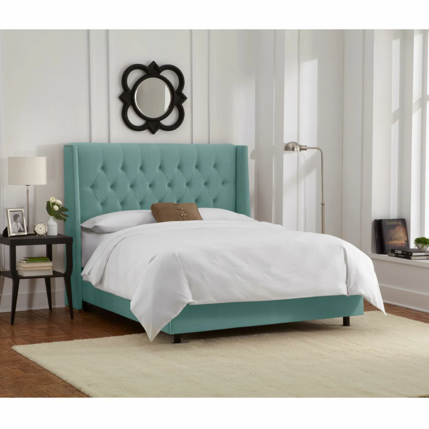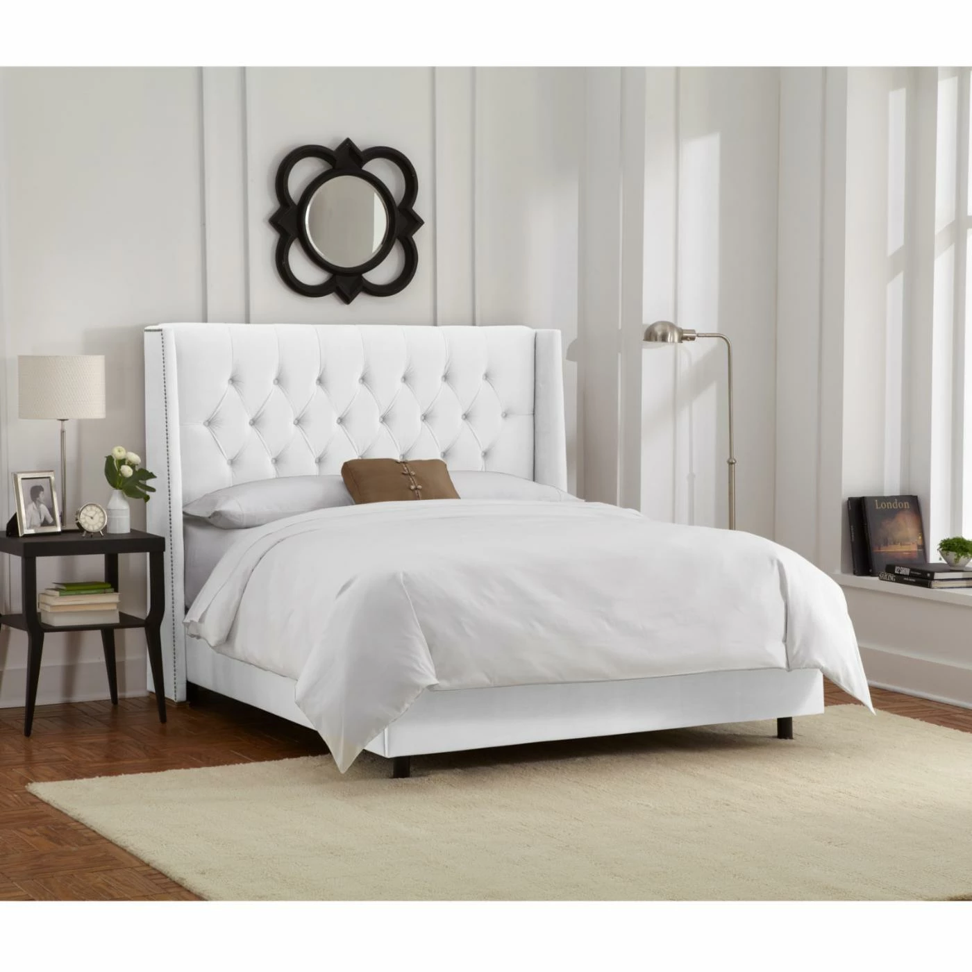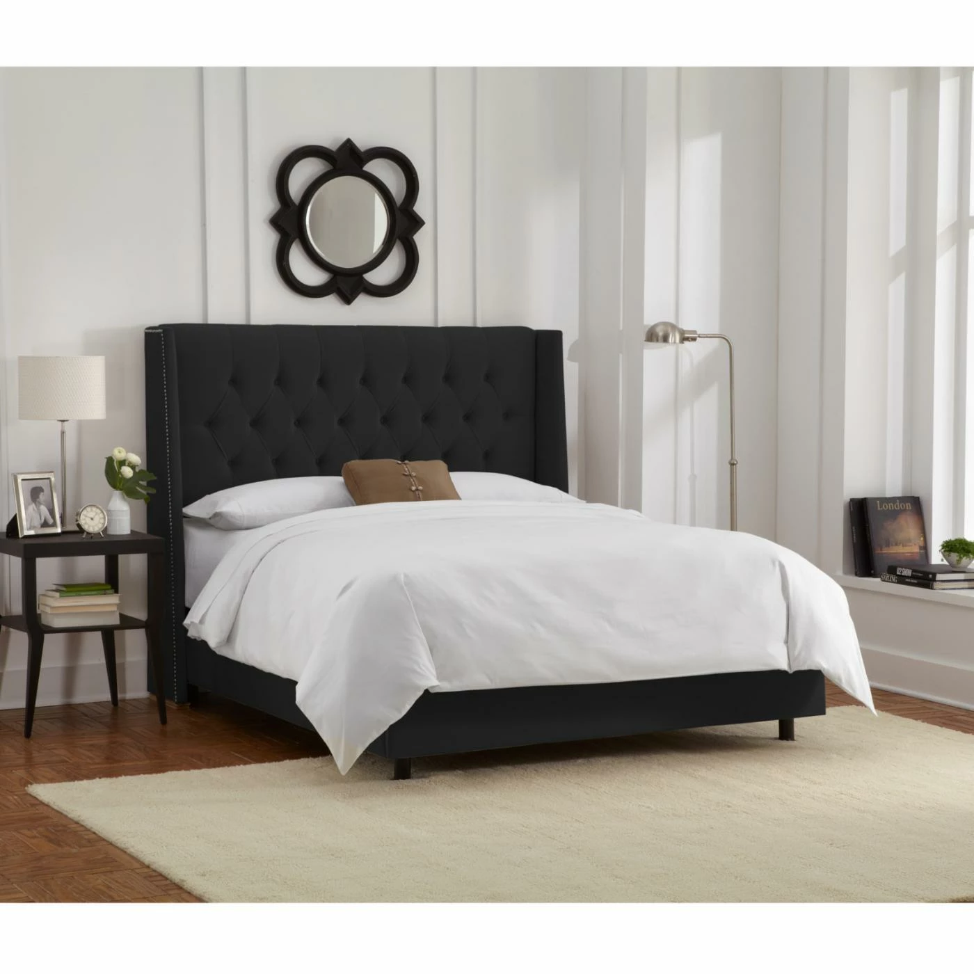Indulge your love of velvet with the Skyline Nail Button Wingback Velvet Upholstered Bed. This up-to-date bed is a fusion of Modern and Victorian influences. The silhouette is sleek and linear, with βshelterβ style wings lined in nailhead trim. Posh velvet upholstery allows you to enjoy the finer things in your own boudoir. This bed is crafted with strong pine wood in the USA. It does not include box springs or a mattress; both are required.