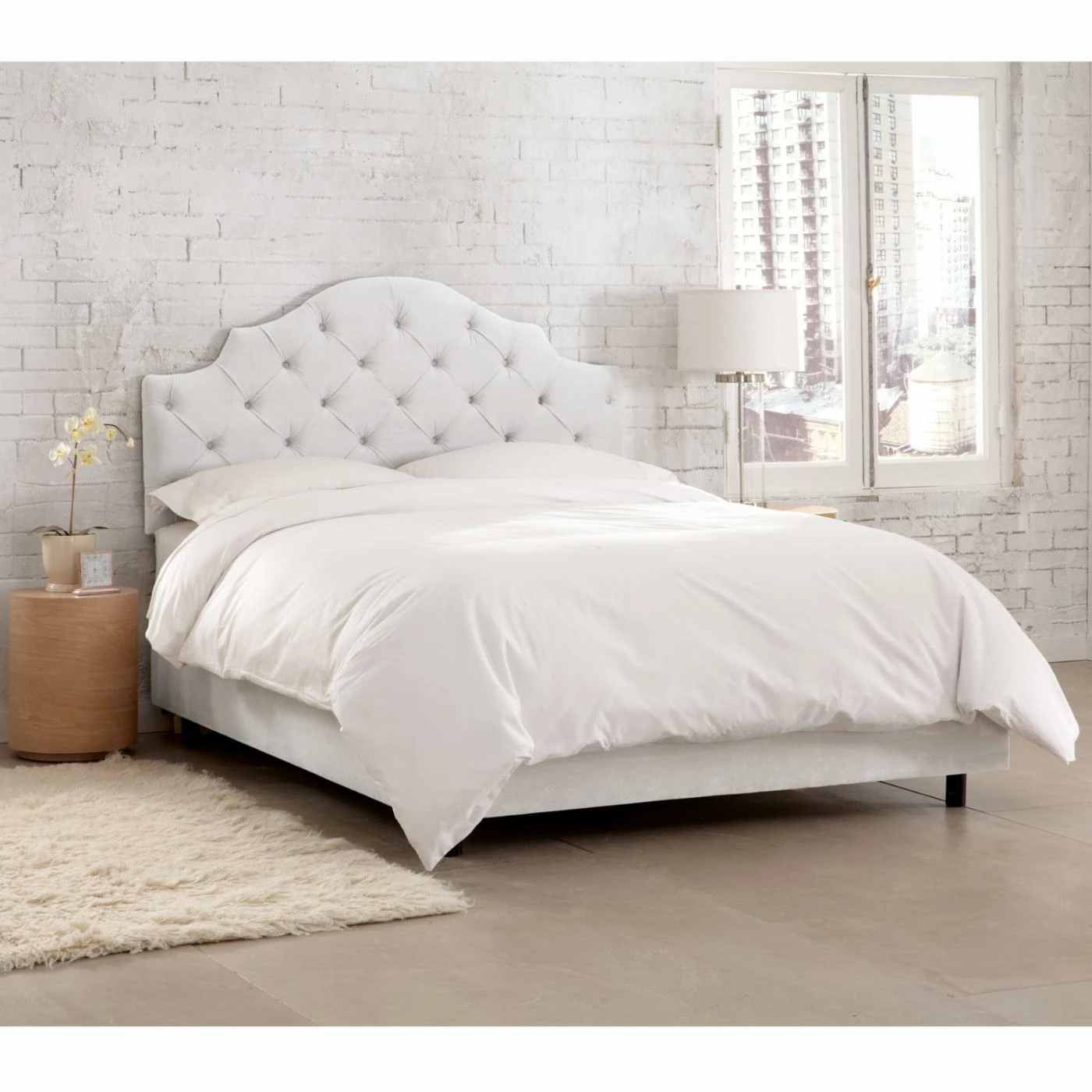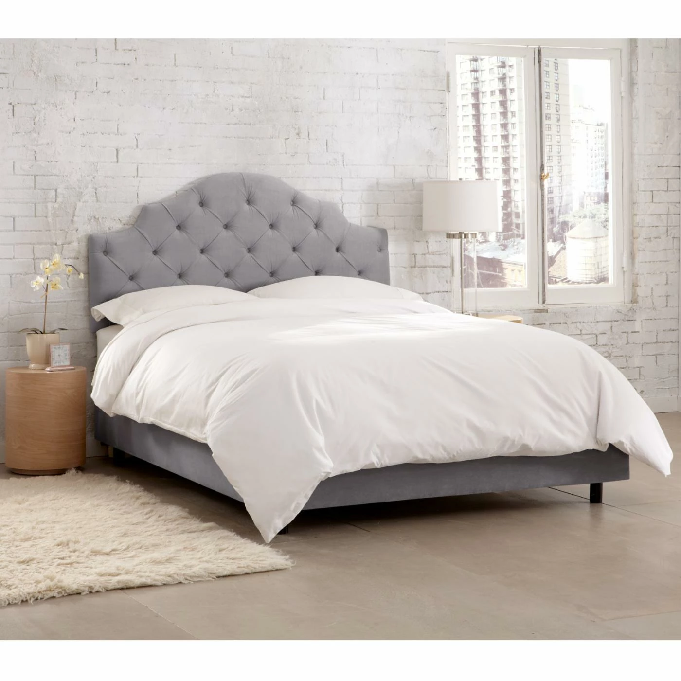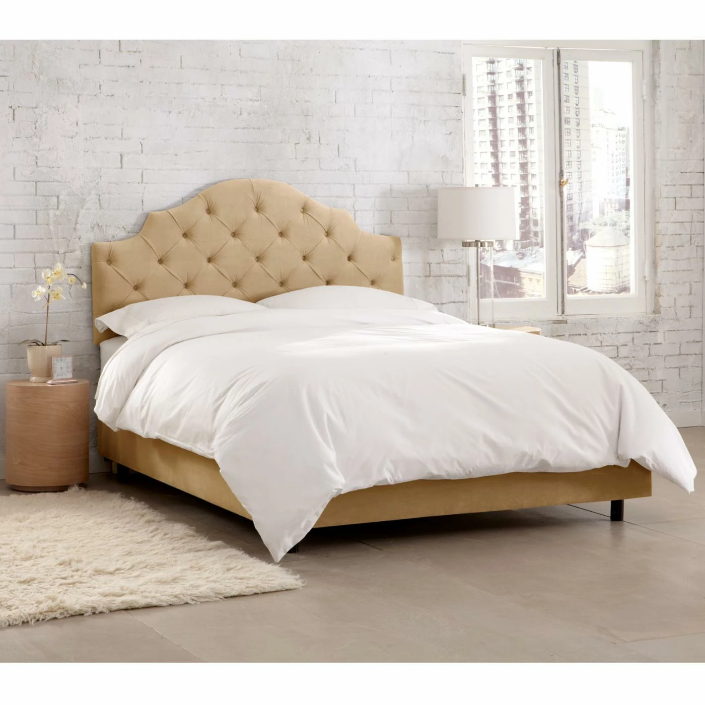 With its curvaceous headboard and sumptuously soft velvet upholstery, the Tufted Notched Velvet Upholstered Bed offers a dreamy place to rest your head. The solid pine headboard is notched and layered with plush foam padding. Luxuriously soft polyester velvet comes in a variety of color option and is graced with diamond tufting. Its low profile footboard and rails create a contemporary profile. Available in select size options.