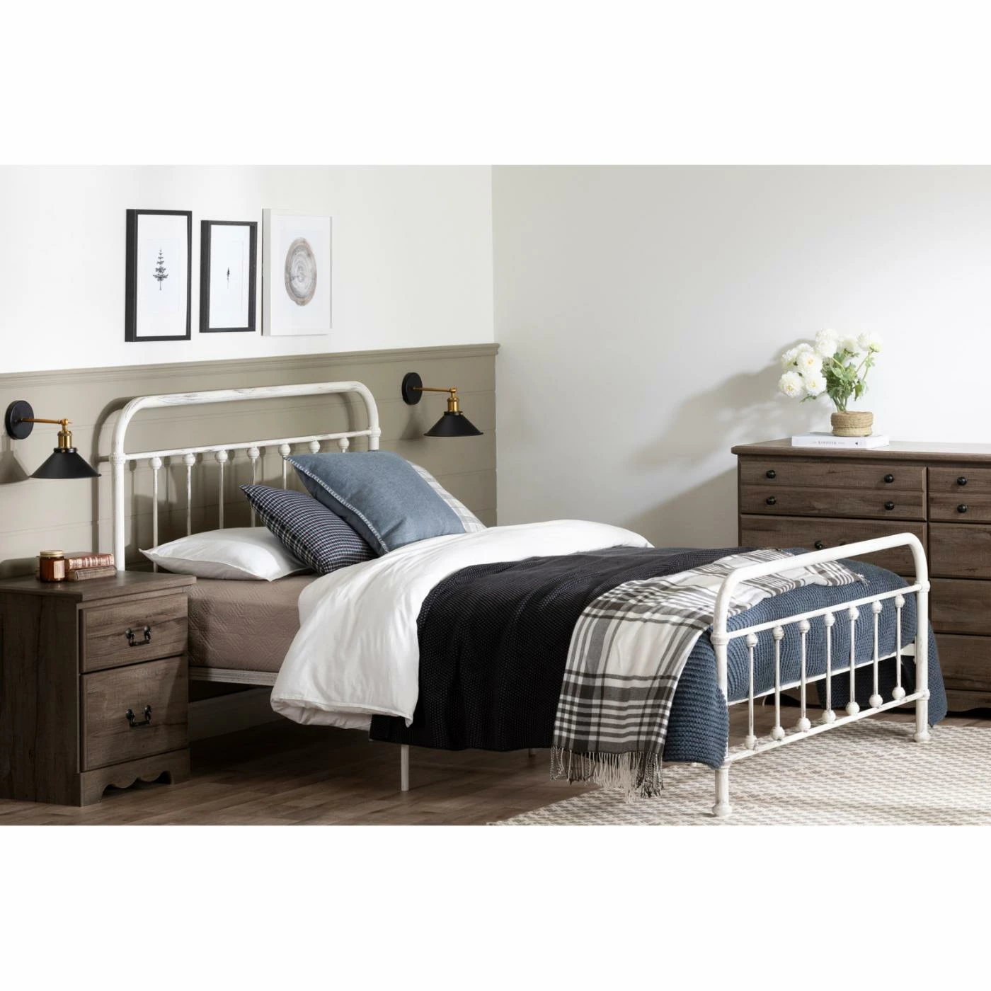 Give your bedroom an industrial-chic makeover with the South Shore Prairie Metal Platform Bed – Queen. This bed features a metal pipe frame with vertical bars in a distressed white finish for a unique, cottage-style addition to your home. Another bonus? This platform bed doesn’t require a box spring. Simply add your mattress, choice of bedding, and your favorite accessories to complete the look. This product includes a manufacturer’s limited 1-year warranty for your convenience. Mattress sold separately.