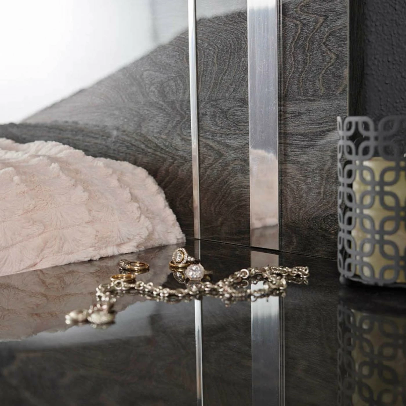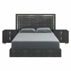 Elegance joins forces with simplicity in the Star International Noble Platform Bed, a stunning focal point for your modern master-bedroom furniture set. Its low-profile design offers an uncluttered appearance. Dense and durable medium-density fiberboard is used to create the frame, capped by a scratch-resistant grey birch acrylic lacquer. A square headboard complements the design (complete with a fully finished back), featuring a thick and thin border made from rust-proof chrome foil resin. A full-length center support leg offers additional stability.