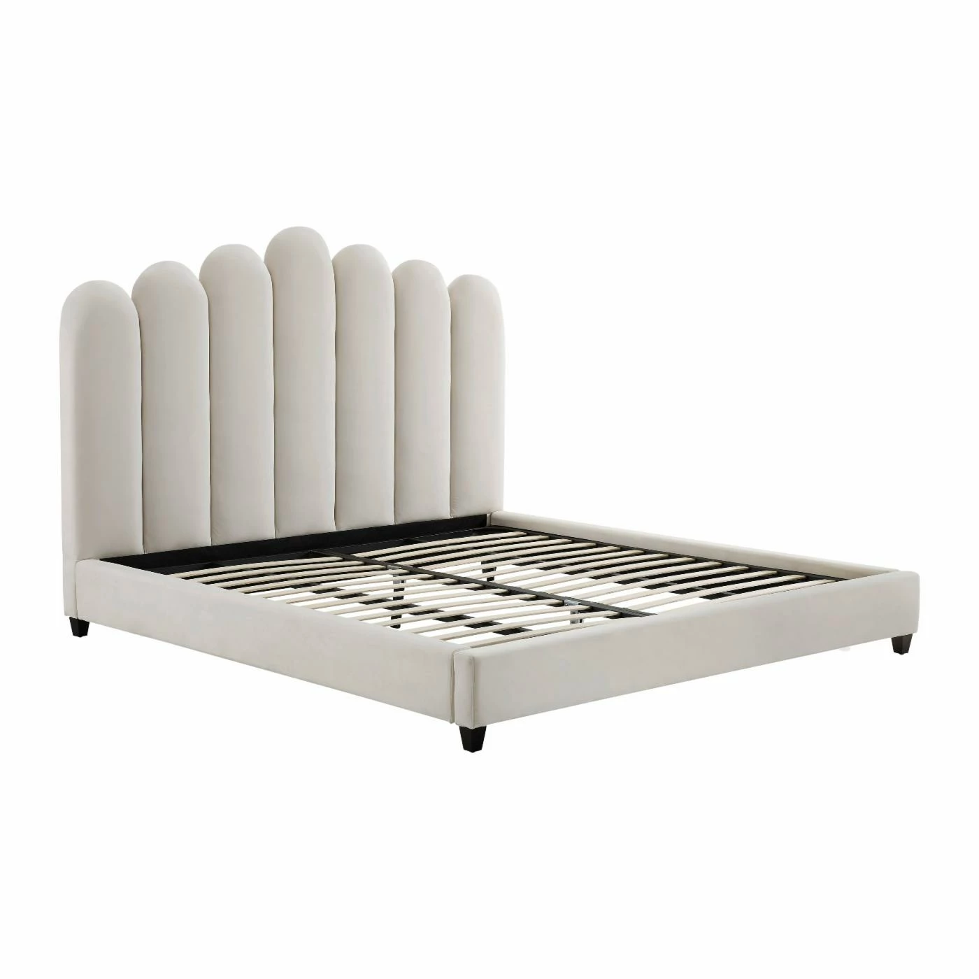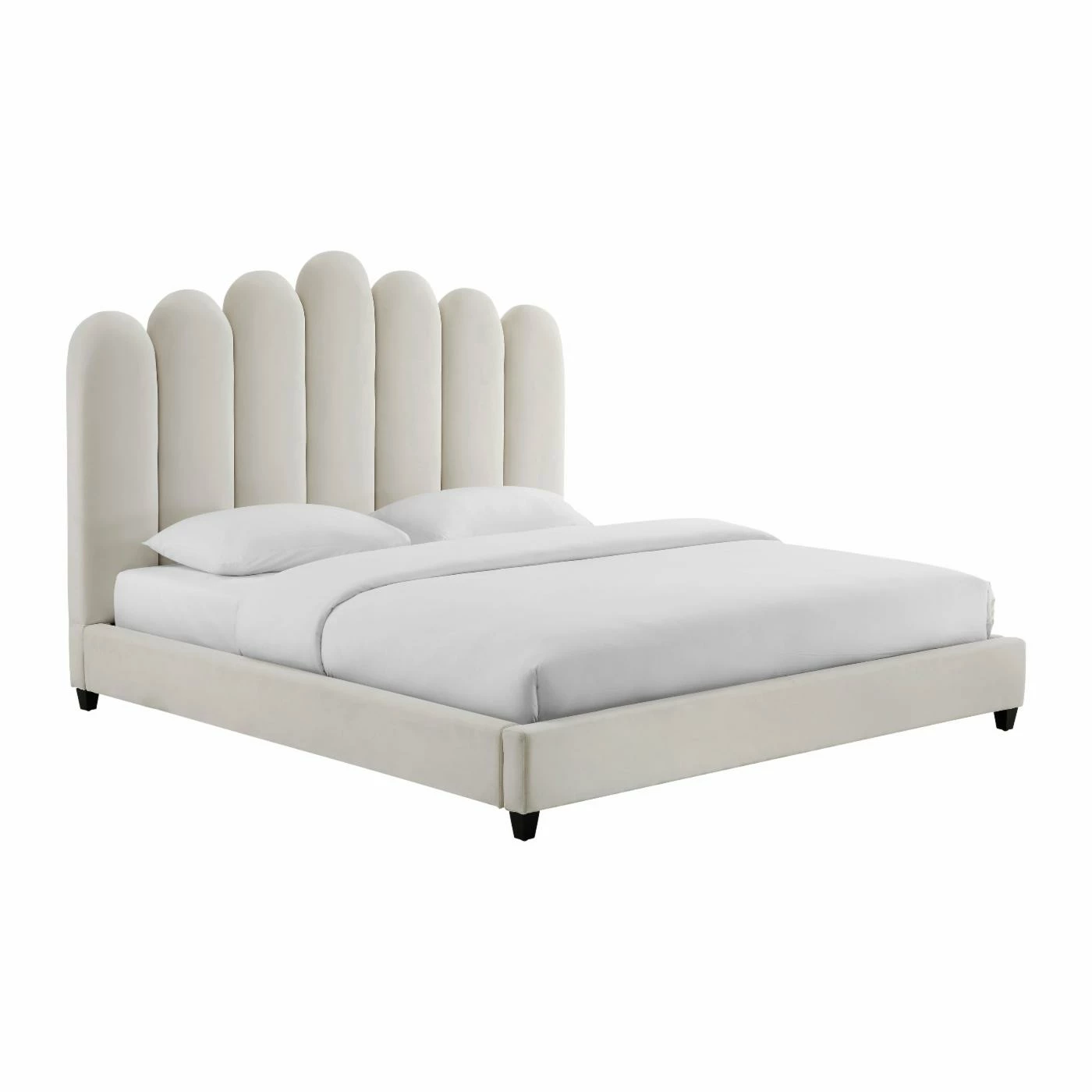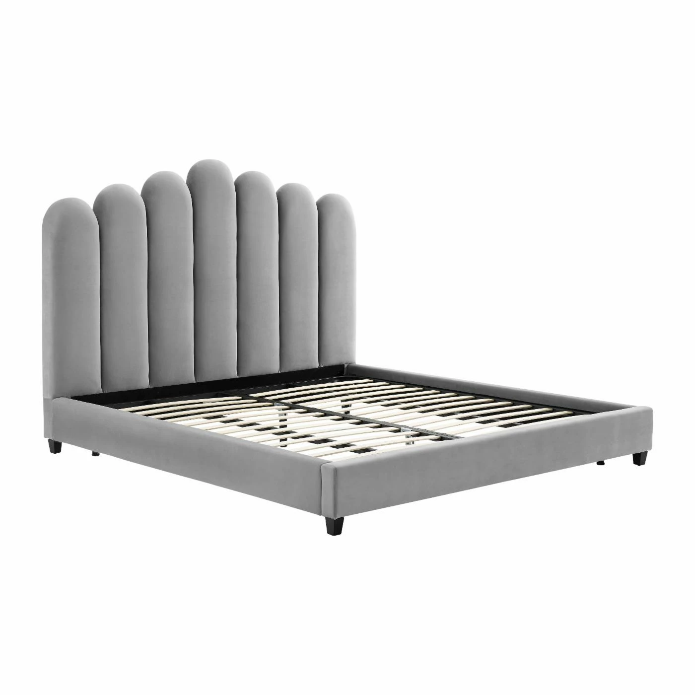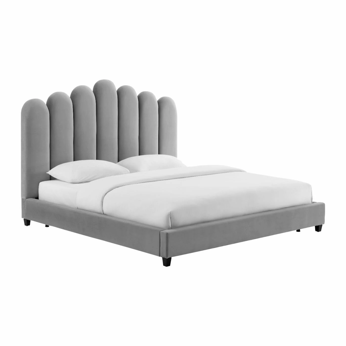 Like a row of marshmallow-soft towers, the channel-tufted, scalloped headboard of the Inspire Me! Home Decor Celine Upholstered Platform Bed is a cozy backdrop to your dreamscape. This modern-glam platform bed features luxe velvet upholstery in your choice of available color on the headboard, side rails, and footboard, leaving birch wood legs as the only hard surfaces. The legs are finished in a black stain to contrast with the upholstery. This platform bed provides comfort without a box spring – slats are included. Choose from available sizes to best fit your space. Add neutral bedding with metallic throw pillows for added glamour.