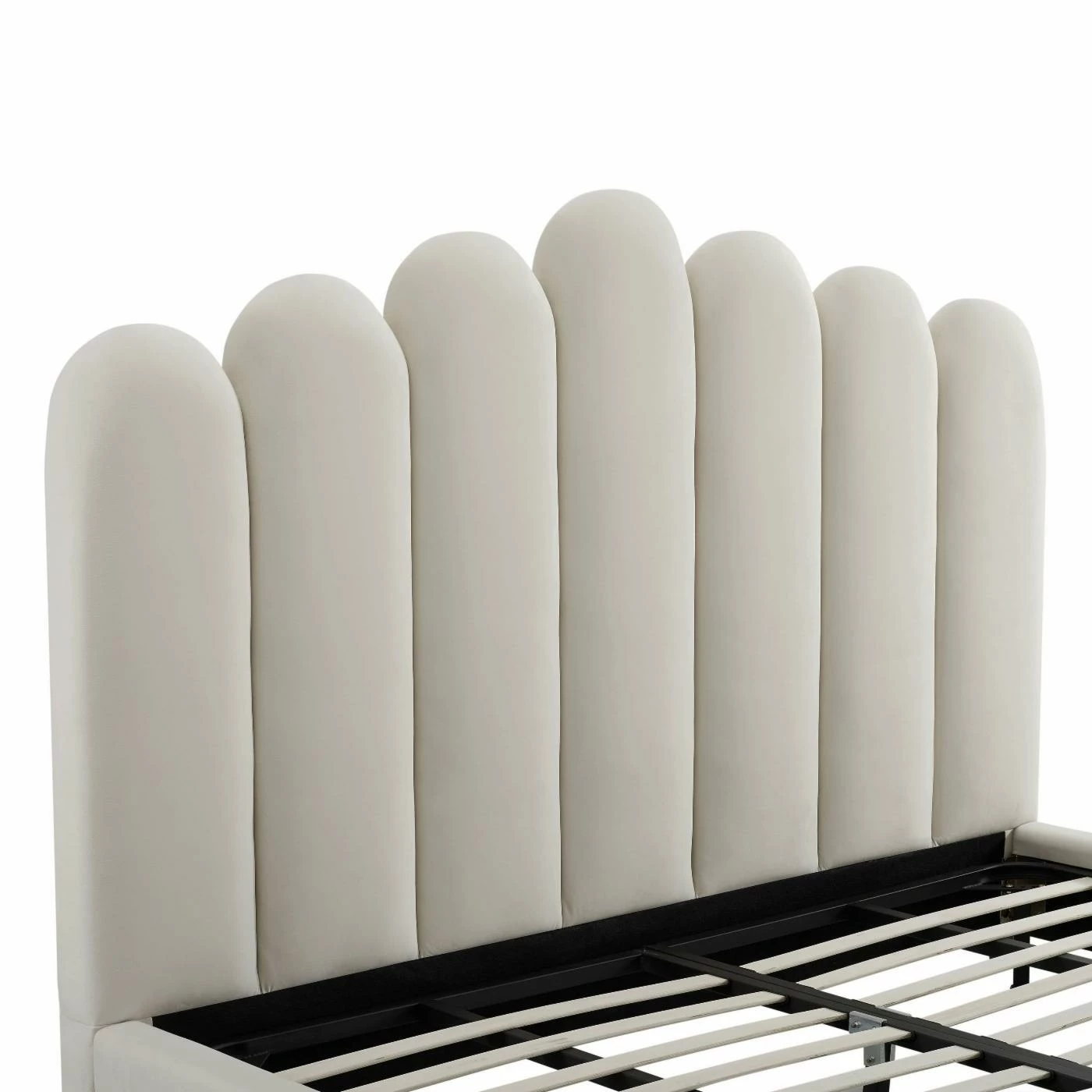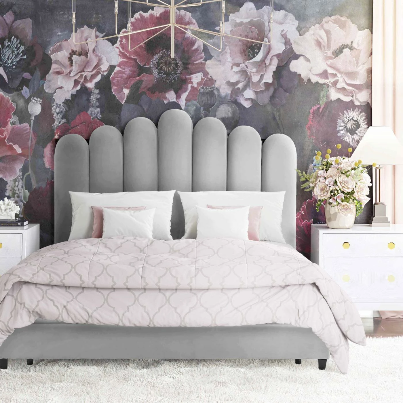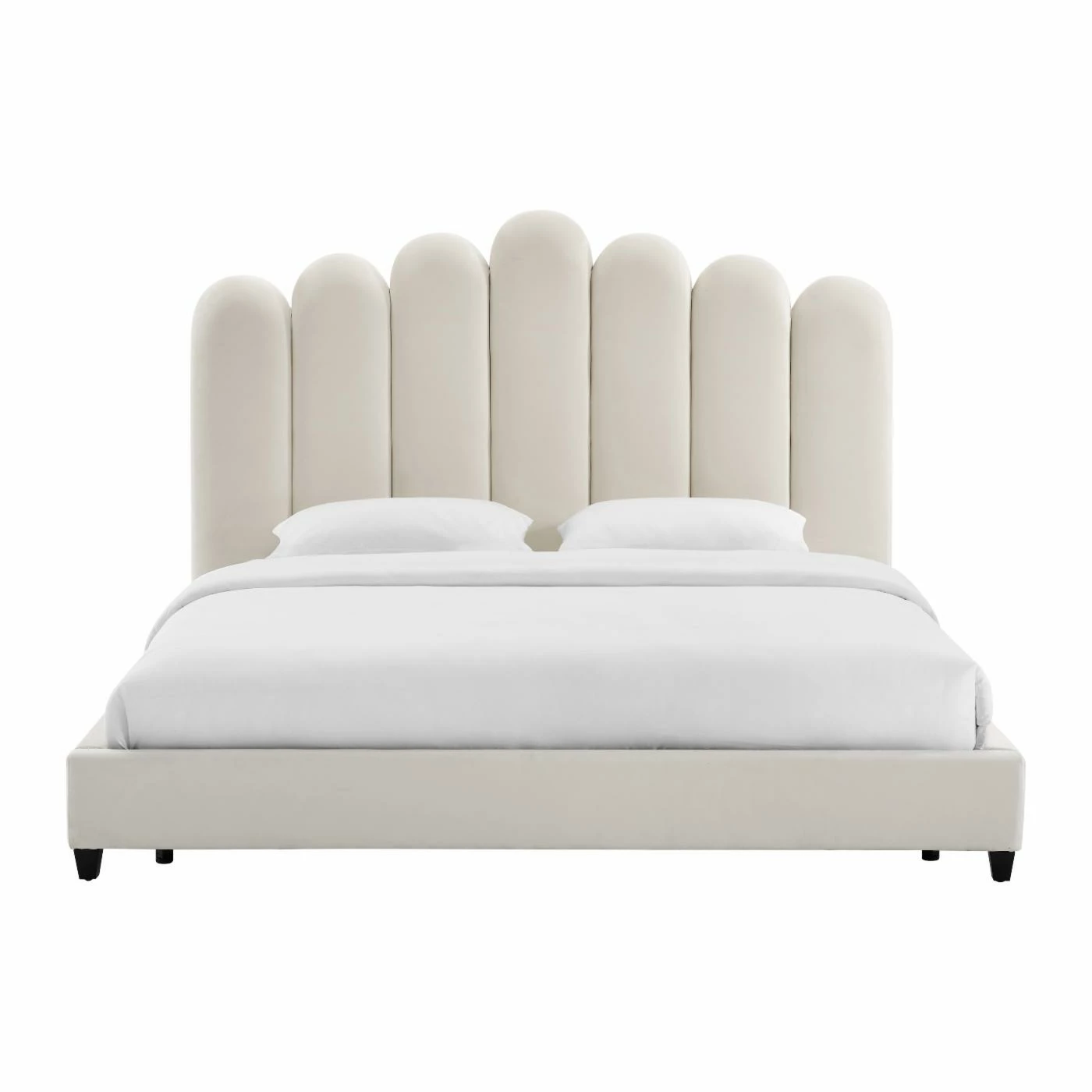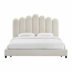 Like a row of marshmallow-soft towers, the channel-tufted, scalloped headboard of the Inspire Me! Home Decor Celine Upholstered Platform Bed is a cozy backdrop to your dreamscape. This modern-glam platform bed features luxe velvet upholstery in your choice of available color on the headboard, side rails, and footboard, leaving birch wood legs as the only hard surfaces. The legs are finished in a black stain to contrast with the upholstery. This platform bed provides comfort without a box spring – slats are included. Choose from available sizes to best fit your space. Add neutral bedding with metallic throw pillows for added glamour.