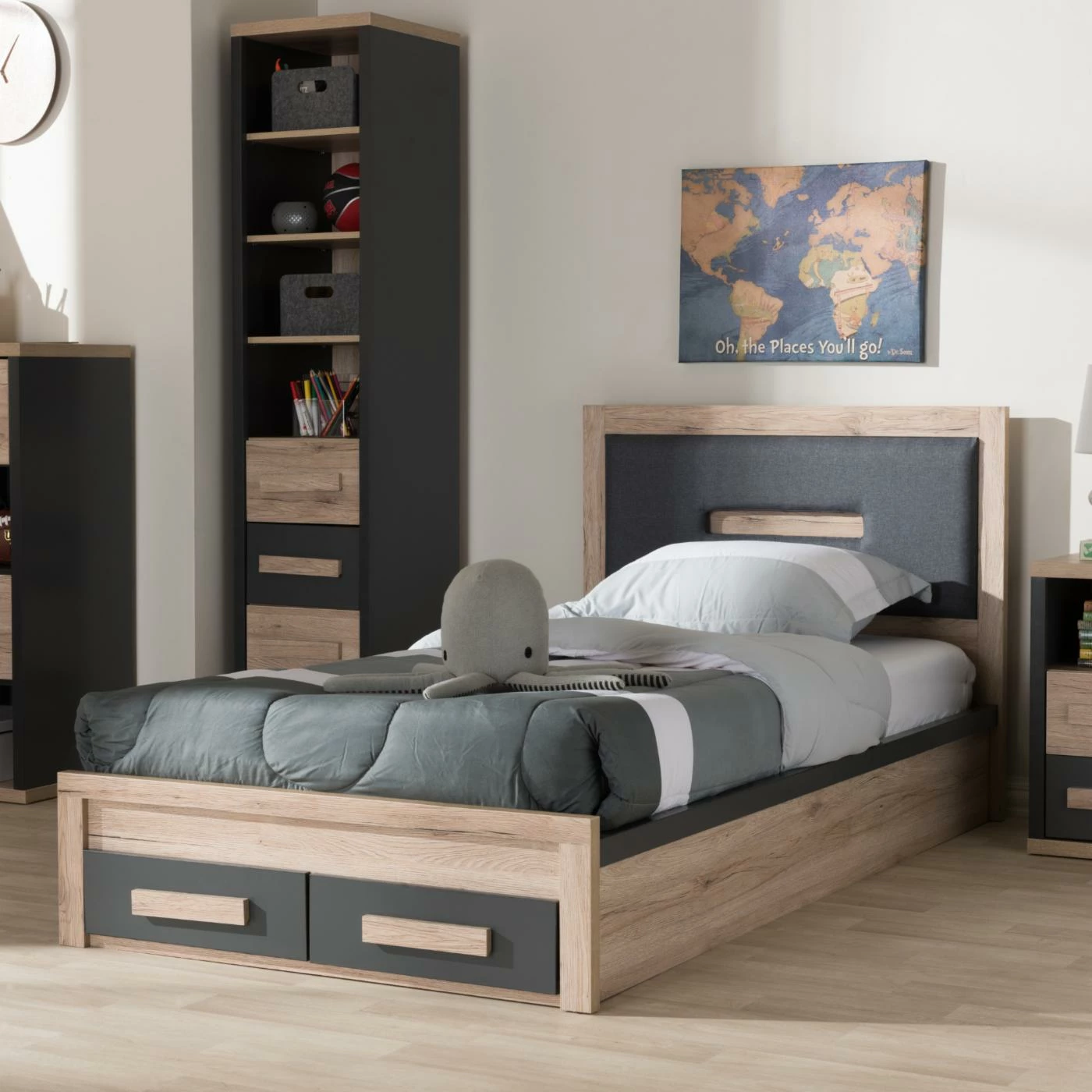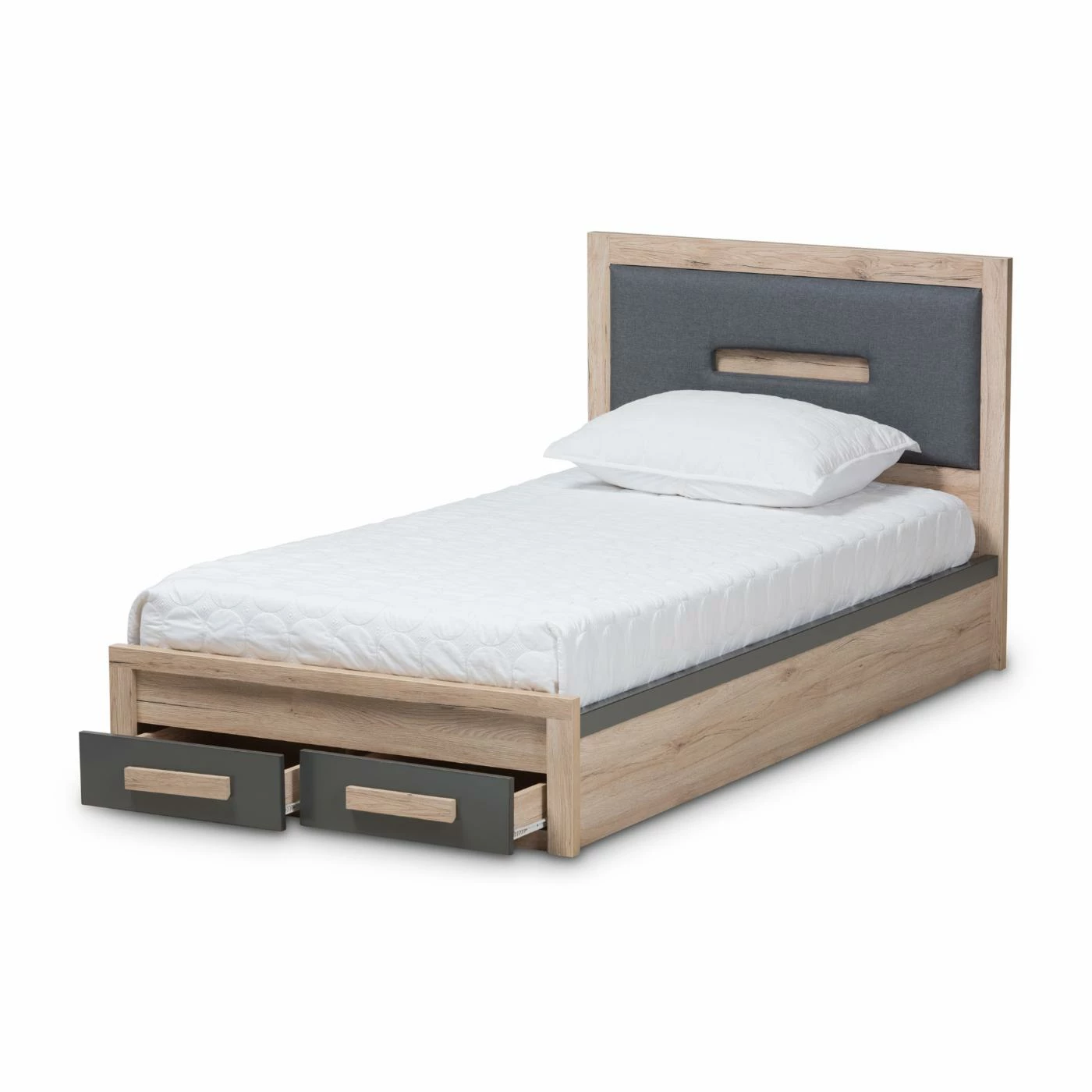 The Baxton Studio Pandora Modern and Contemporary Dark Gray and Light Brown Two-Tone 2-Drawer Storage Platform Bed is perfect for spare bedrooms and children’s rooms. This twin size bed is made from durable rubber wood with engineered wood in a modern two-tone design. The padded headboard with gray polyester upholstery is complemented by two drawers at the foot of the bed, perfect for storing extra linens or toys. No box spring is required, simply place your mattress on top of the slat support system.